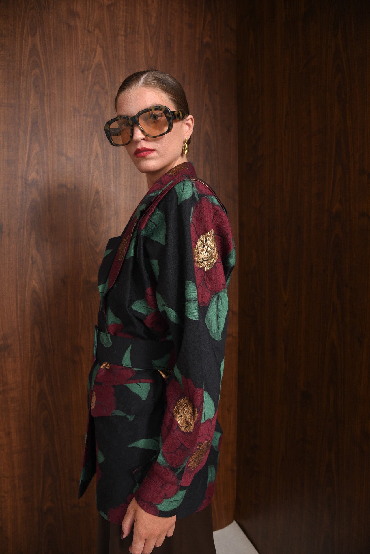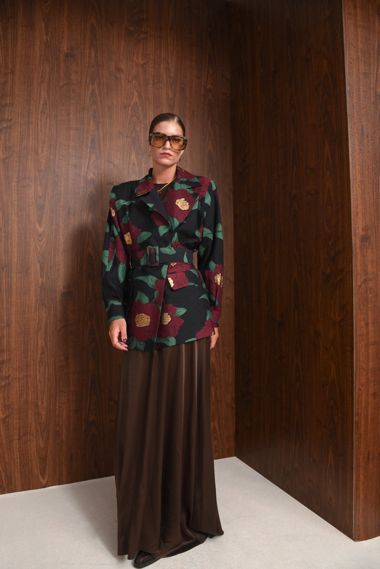 Believe Blazer, a bold statement blazer with an all-over floral pattern and gold detailing. Designed with strong structured shoulders, a notched lapel, and a matching belt for a defined waist. Featuring front flap pockets, a smooth lining, and a tailored longline fit. A standout piece that elevates any look with colour, structure, and personality.