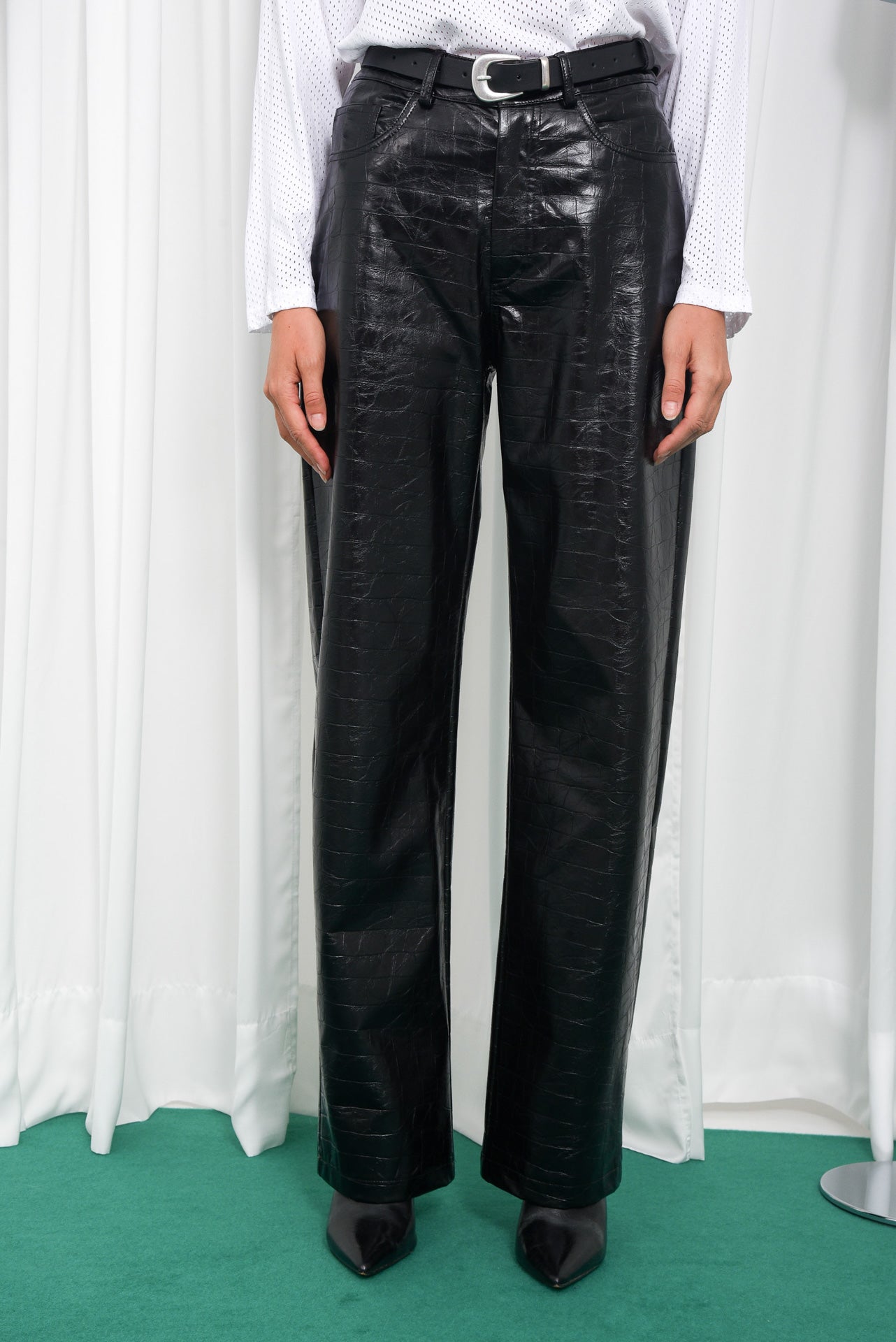 The Exist Pants are made from soft, crocodile-embossed faux leather that adds texture and shine to any look. Designed with a straight-leg fit, high-rise waist, and classic five-pocket styling. They feature belt loops, a front button and zip closure, and a smooth inner lining for all-day comfort.