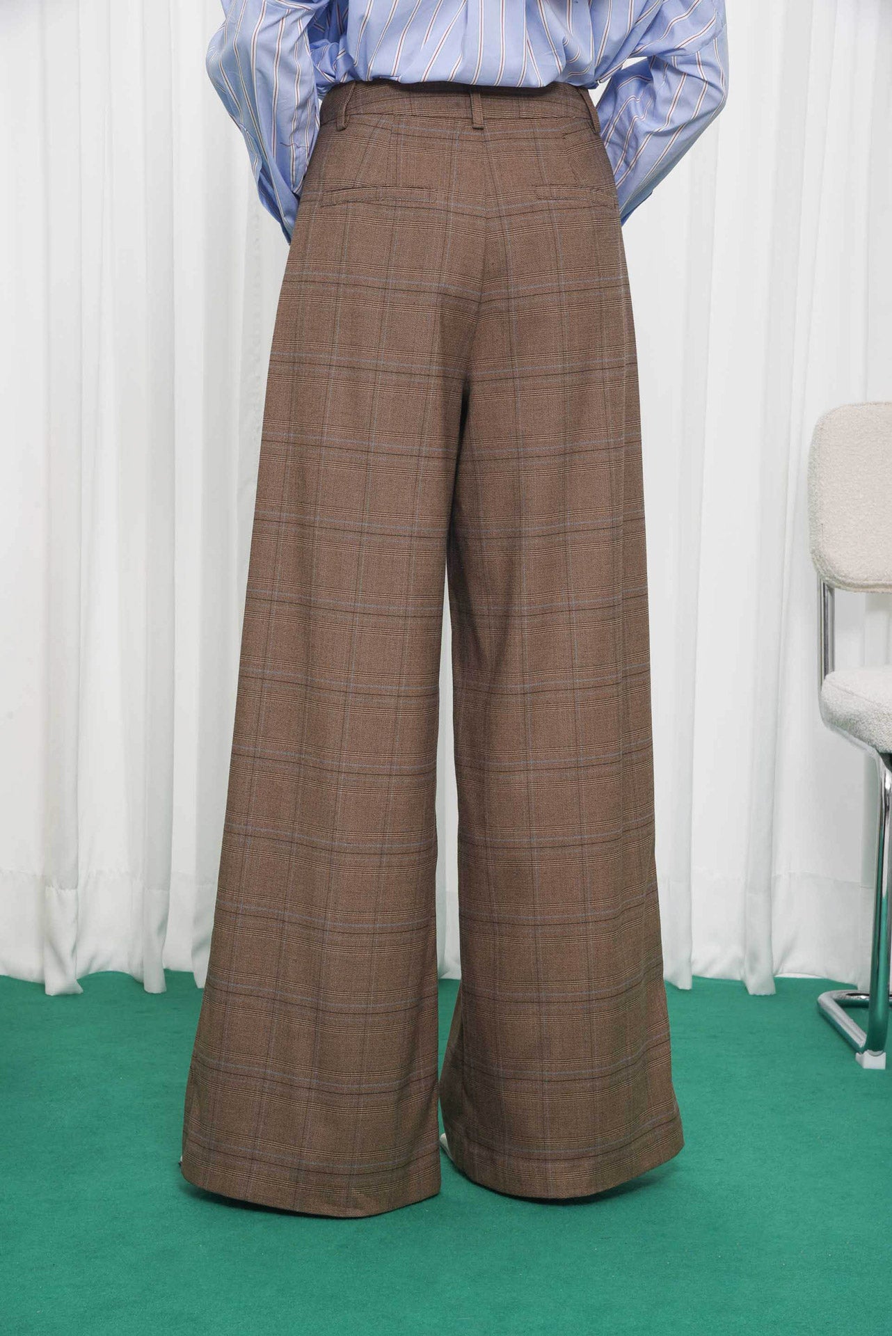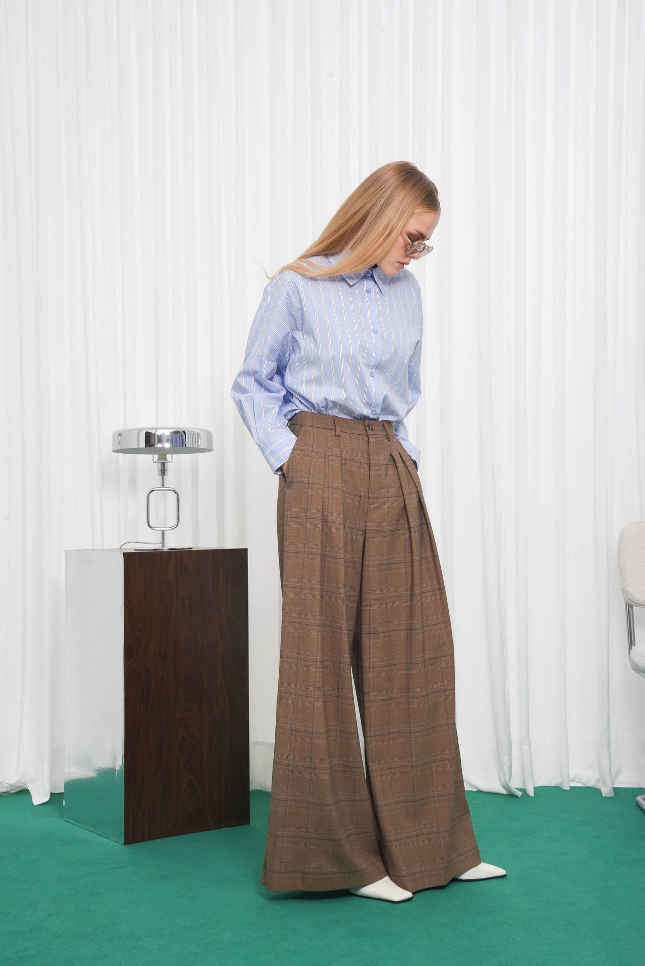 The Liberation pants are tailored from a soft plaid fabric blend in warm brown tones with fine blue lines. They feature a high-rise waist, pleated front, side and back pockets, and a wide-leg silhouette that drapes fluidly. Elegant yet comfortable, they pair perfectly with the matching blazer or trench coat.