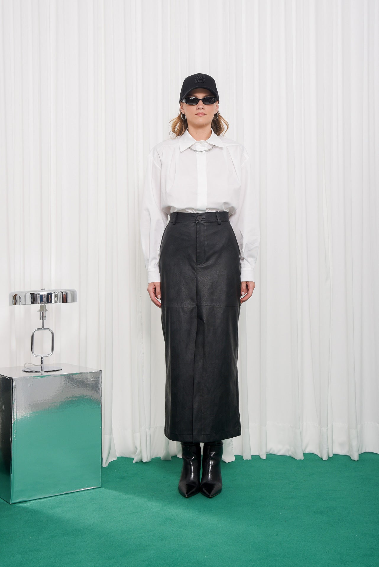 The Purpose Skirt is crafted from soft faux leather with a smooth matte finish. Designed in a flattering high-waist, midi-length silhouette, it features clean seam detailing and a front slit for ease of movement. A refined essential for both casual and polished outfits.