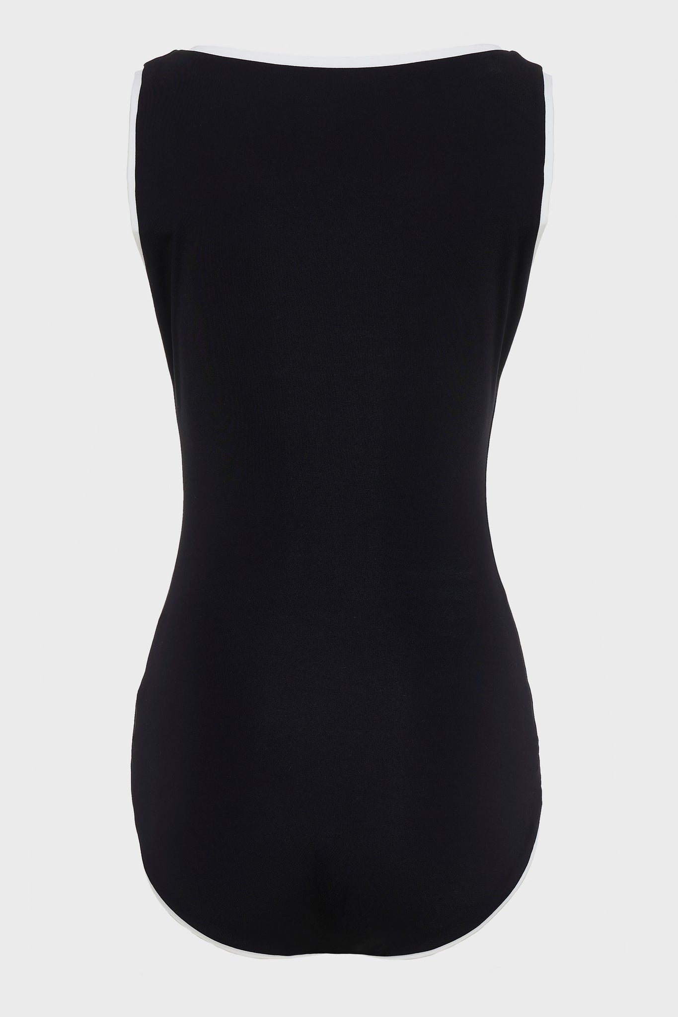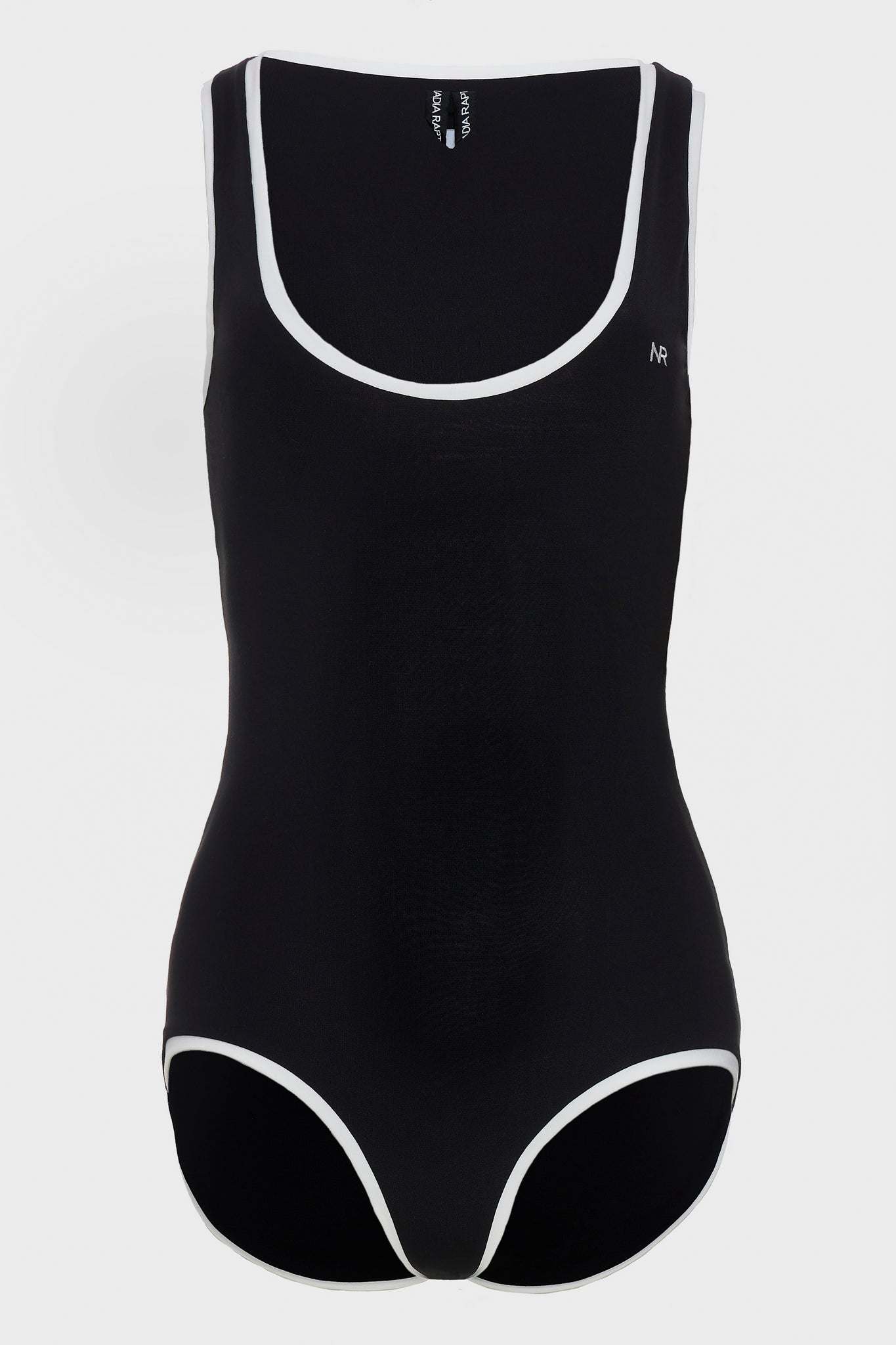 A sleeveless bodysuit with a contrast trim and scoop neckline, designed to hug the body with a flattering fit. Made from soft jersey fabric that moves comfortably with you. Features a small NR logo on the front. Available in black with white trim and white with black trim.