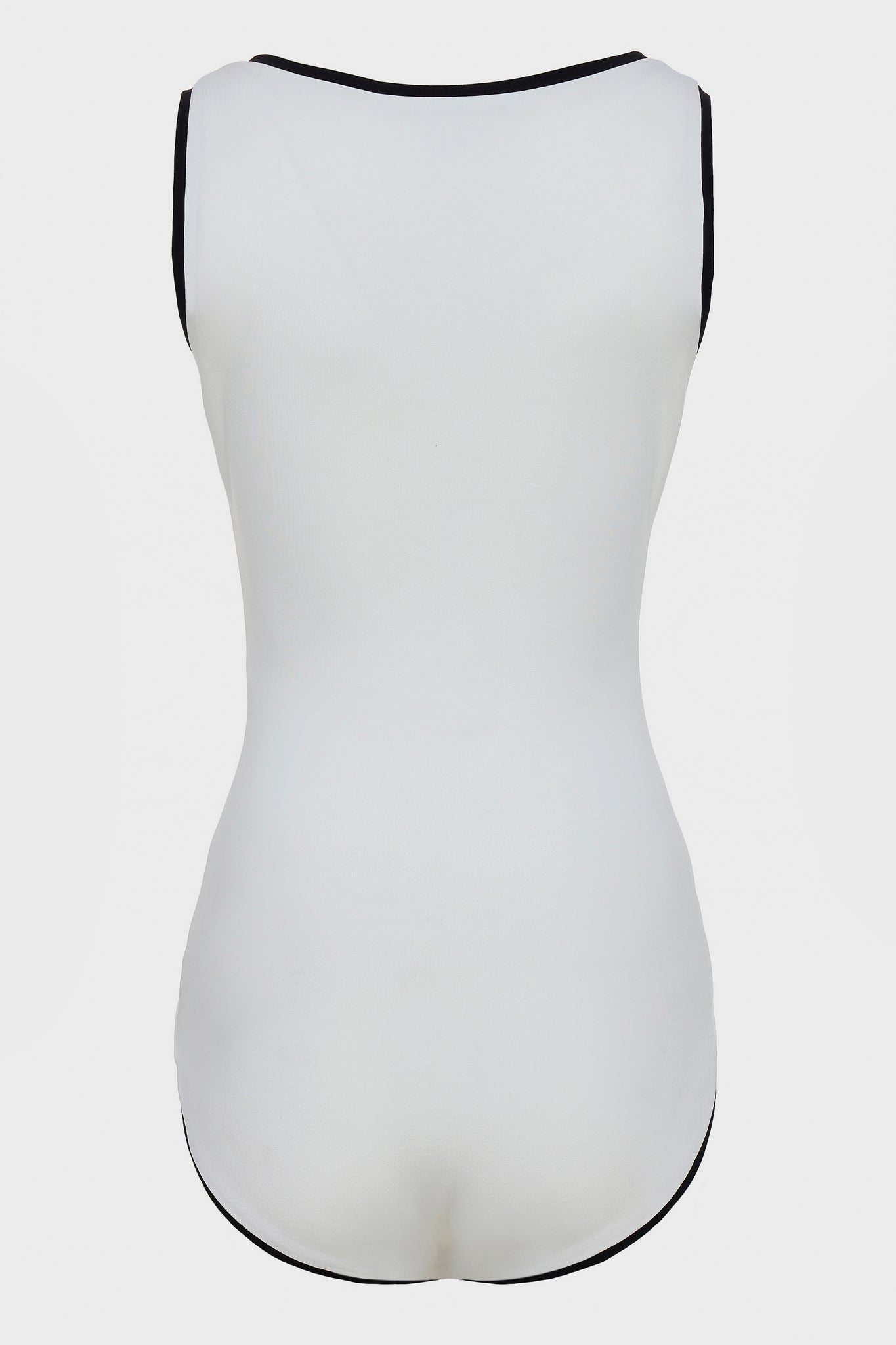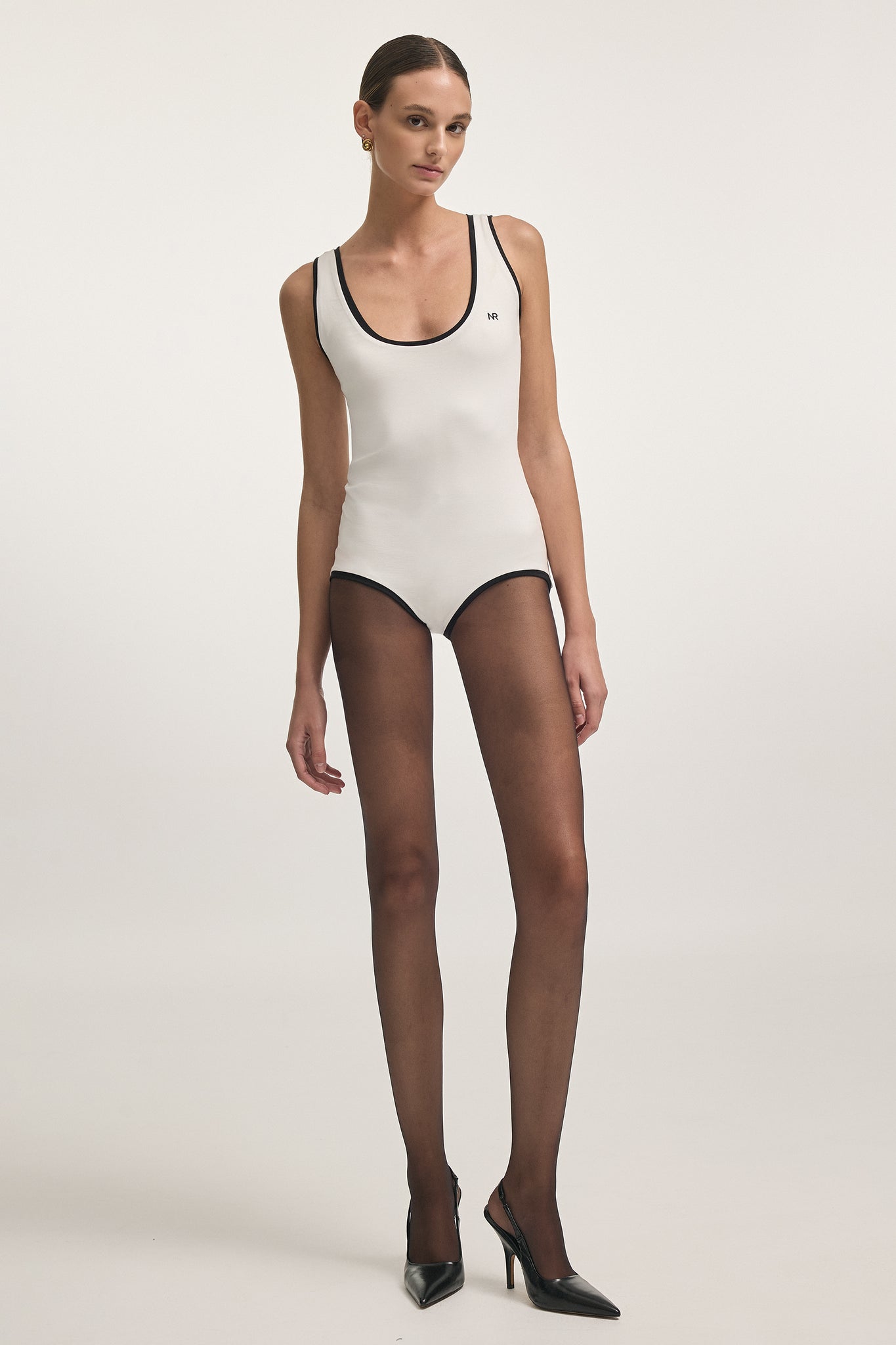 A sleeveless bodysuit with a contrast trim and scoop neckline, designed to hug the body with a flattering fit. Made from soft jersey fabric that moves comfortably with you. Features a small NR logo on the front. Available in black with white trim and white with black trim.