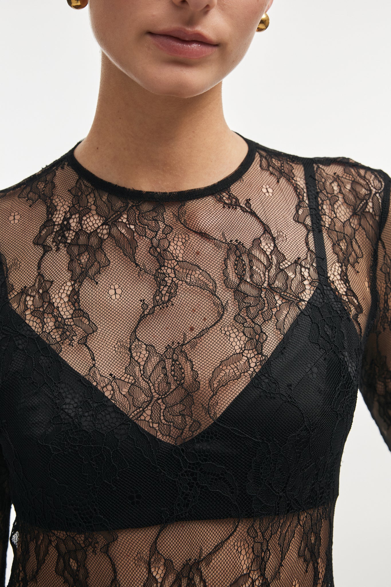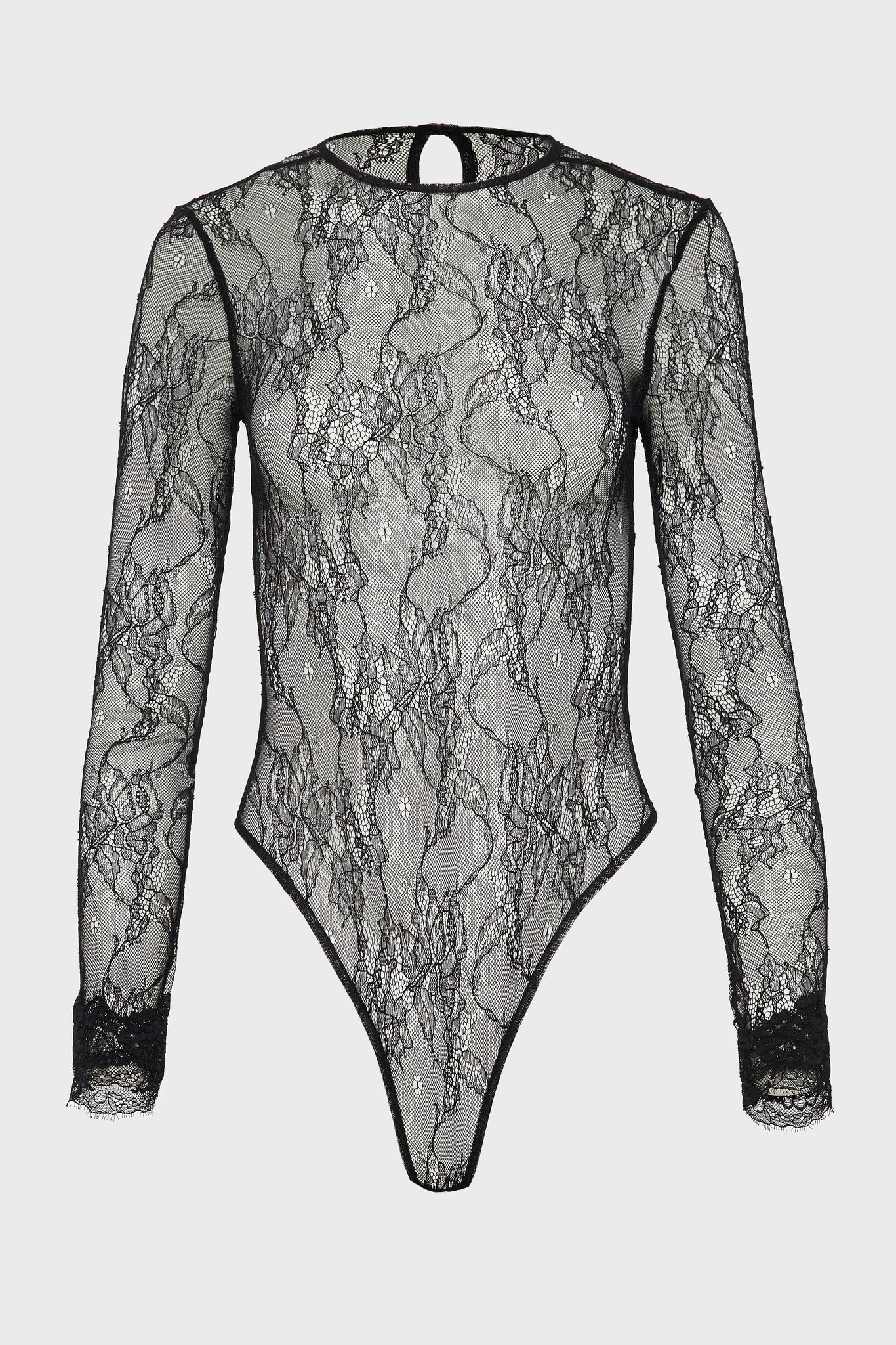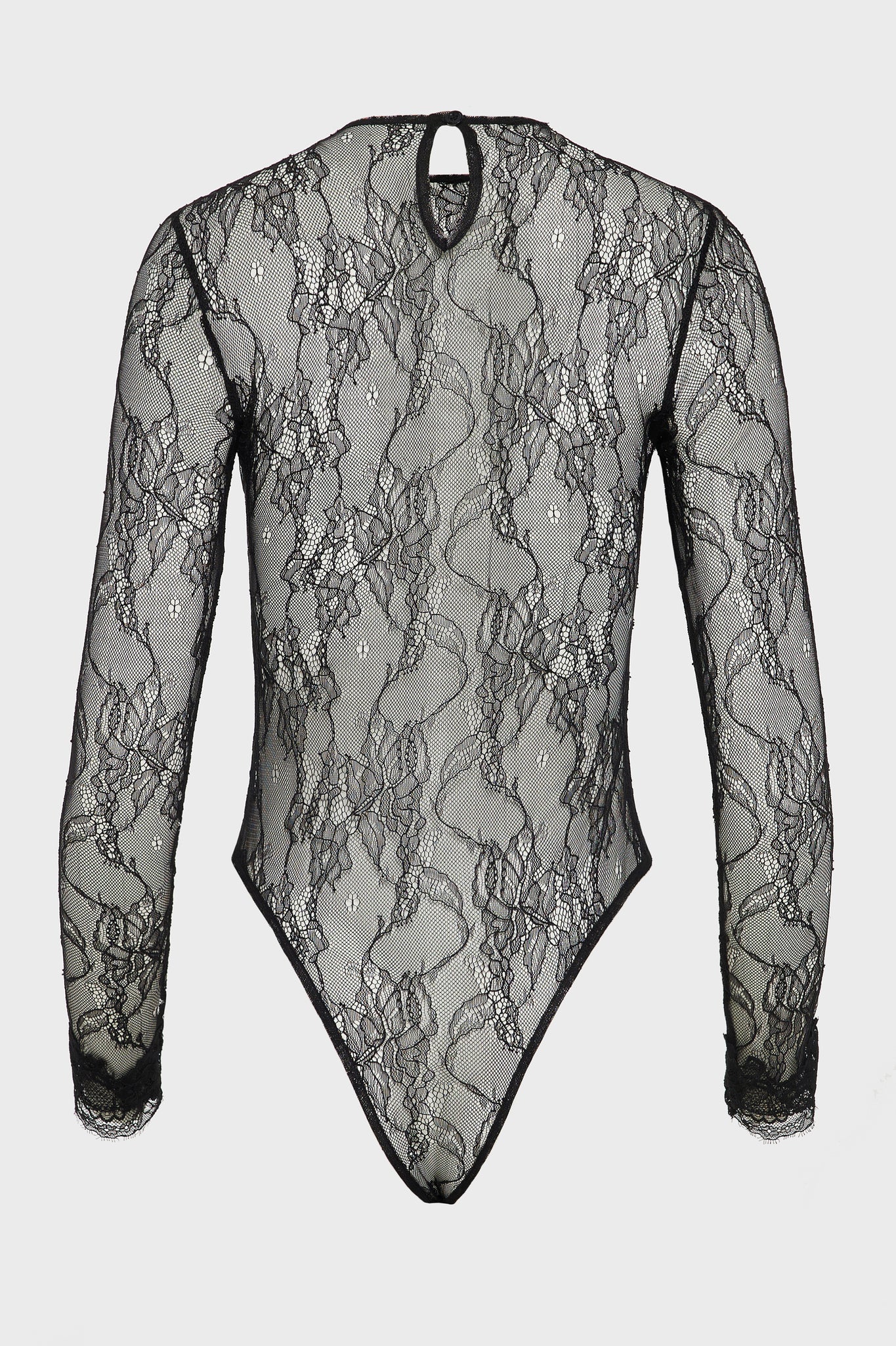 An exploration of transparency and restraint. The Veil Bodysuit is crafted from delicate lace, tracing the body with precision while maintaining a sense of quiet refinement. The sheer surface reveals and conceals in equal measure, creating a subtle interplay between structure and softness. Cut to contour the silhouette, the elongated sleeves and clean neckline enhance its fluid line. The lightweight lace sits close to the skin, offering a second-skin sensation without excess. Designed to move seamlessly between layering and statement dressing worn beneath sharp tailoring or on its own with considered simplicity.