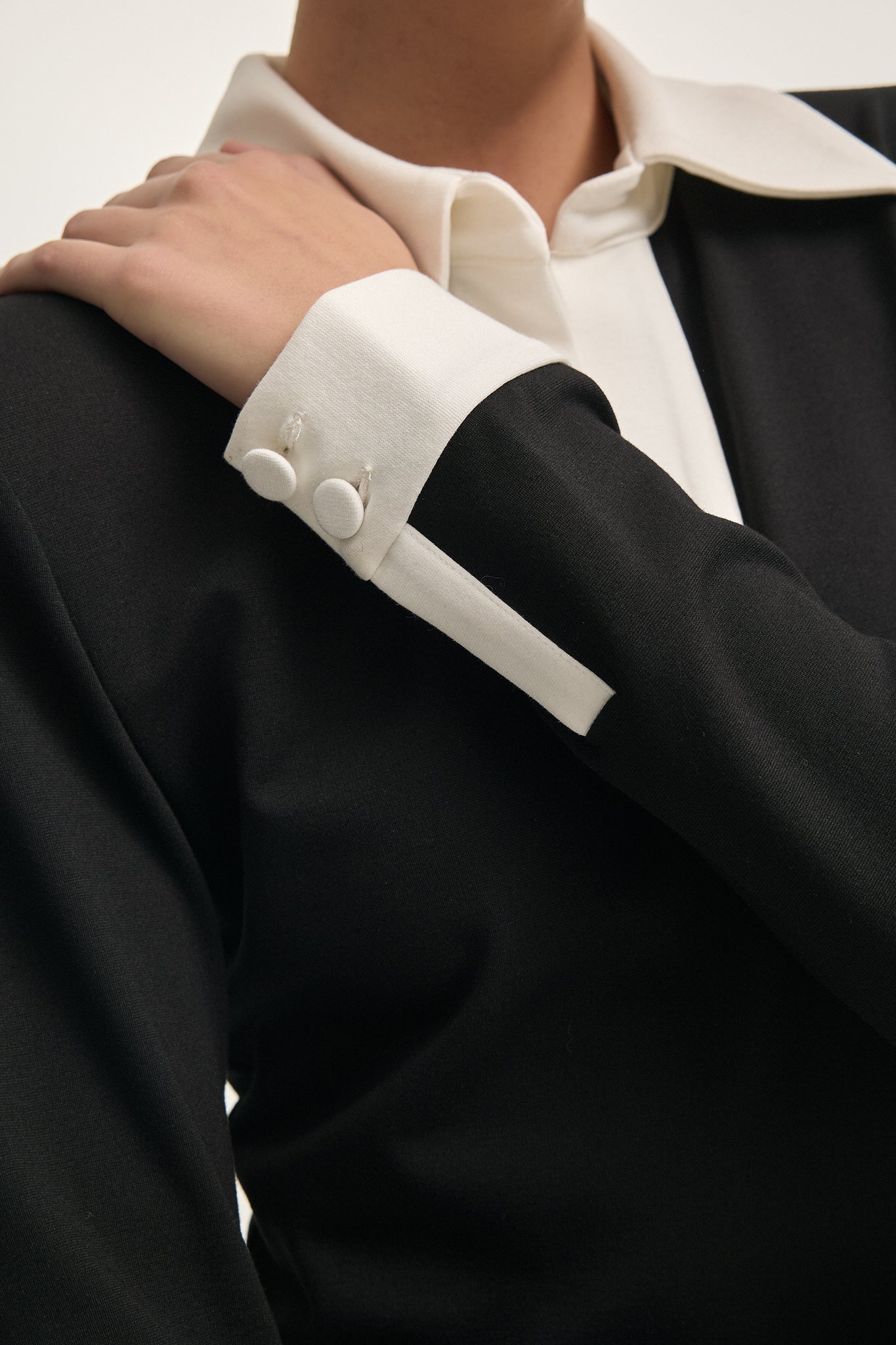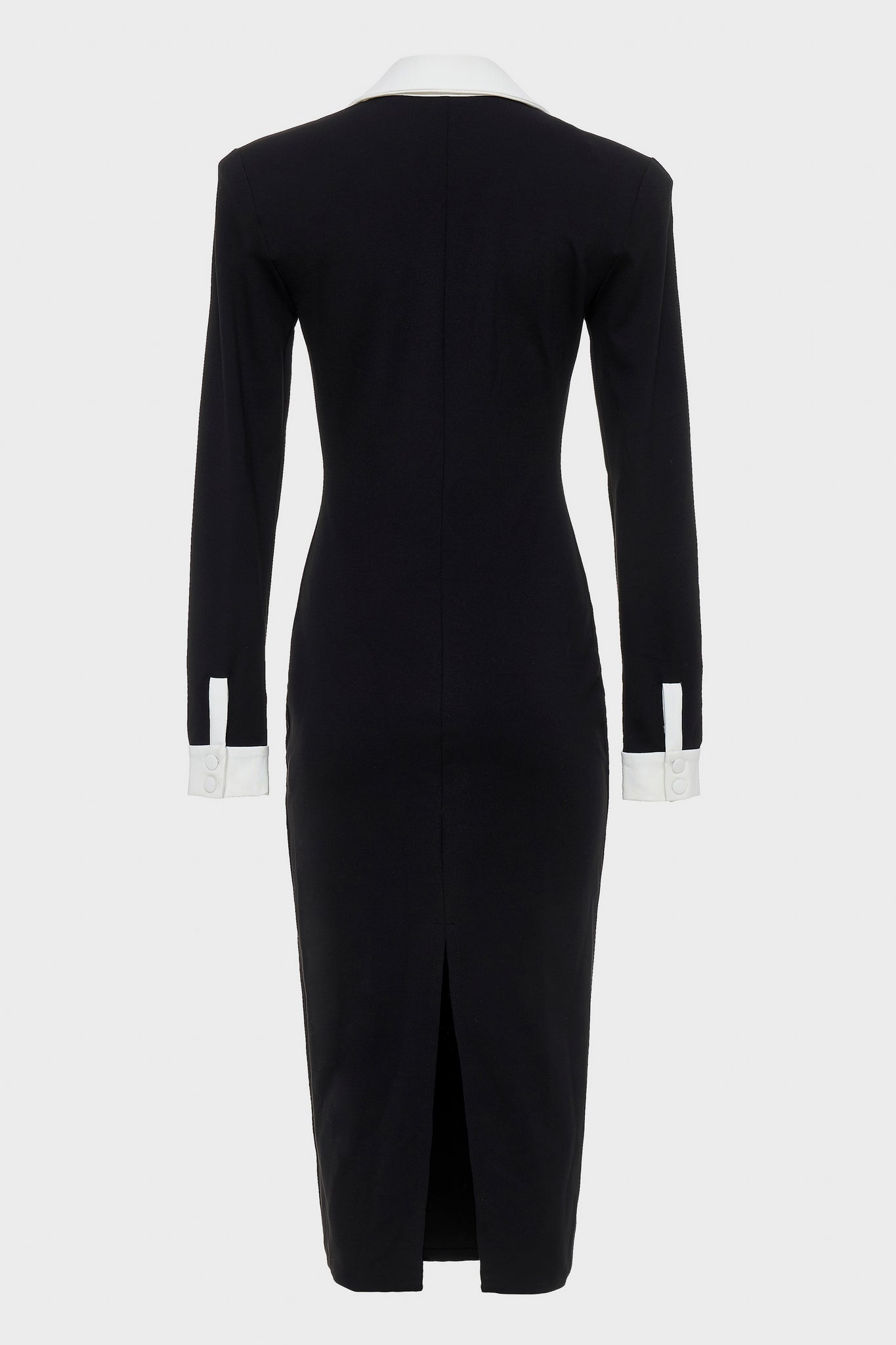 A long-sleeved maxi dress crafted from soft jersey punto fabric. Defined by a sharp contrast collar and cuffs, it combines precision and ease in a single gesture. The elongated silhouette follows the body with quiet confidence, while subtle stretch ensures comfort and movement. A modern interpretation of understated sophistication.