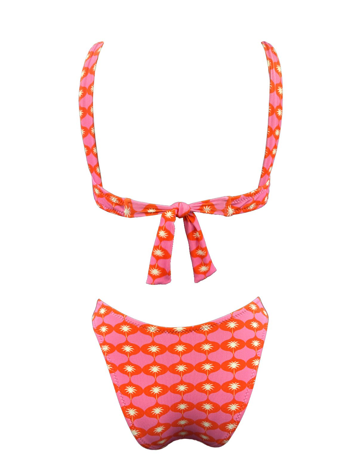 Bikini top with underwire that ties at back and high-rise bikini bottom.