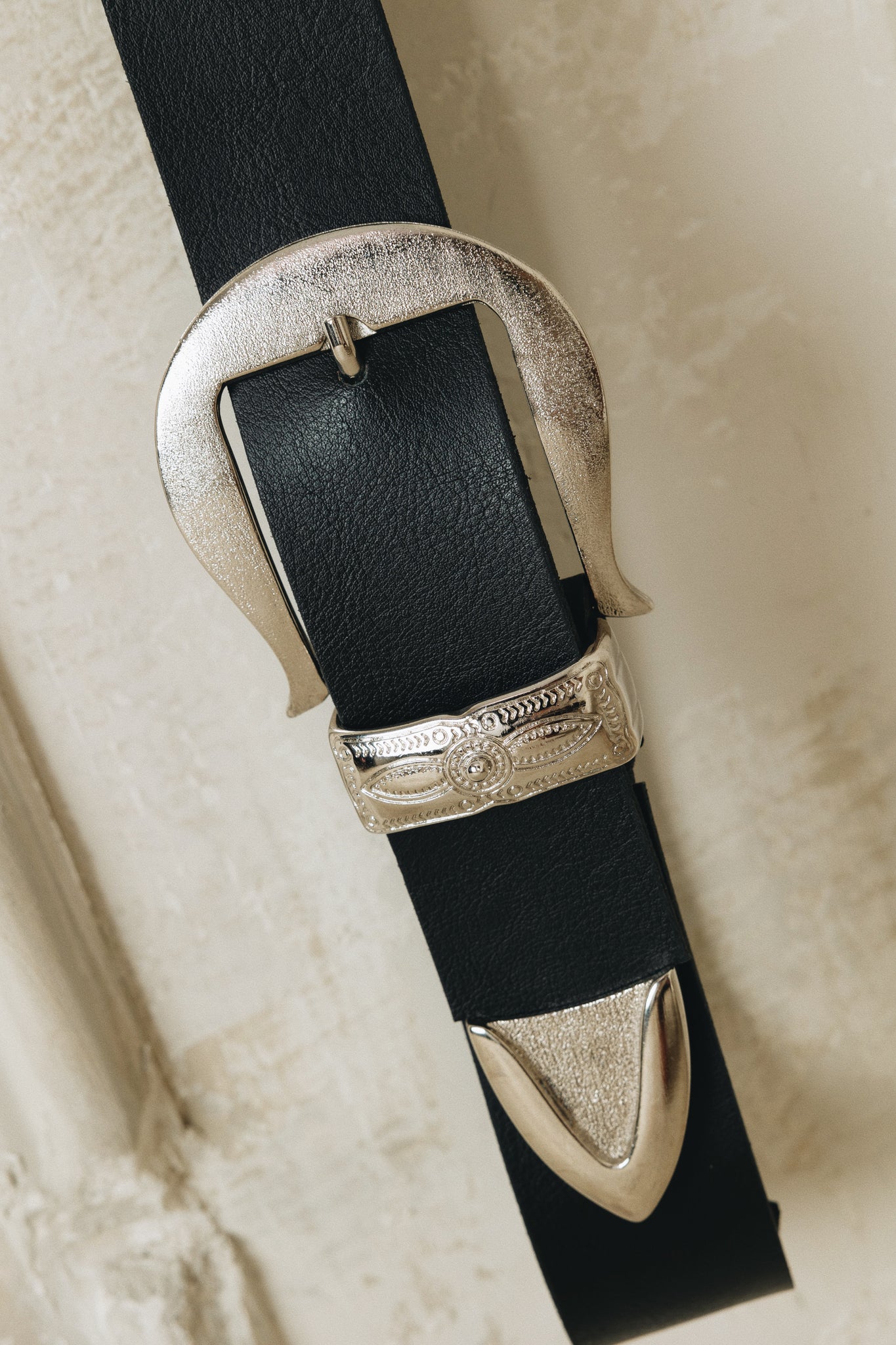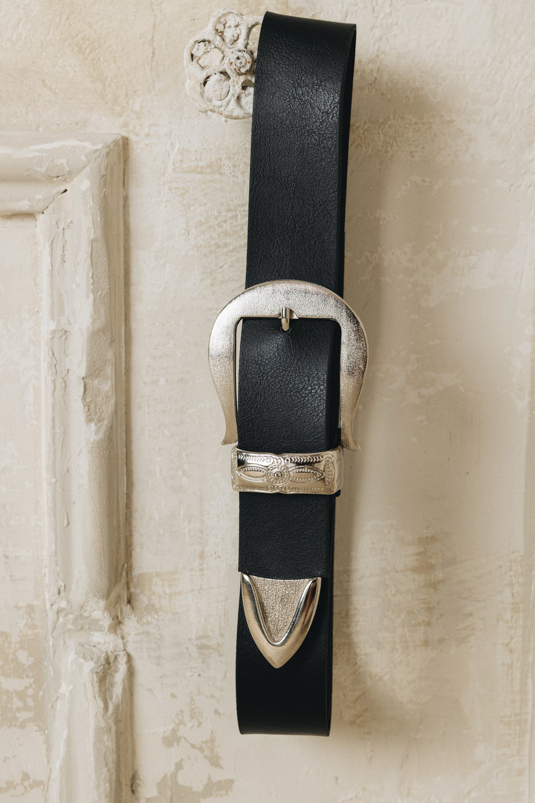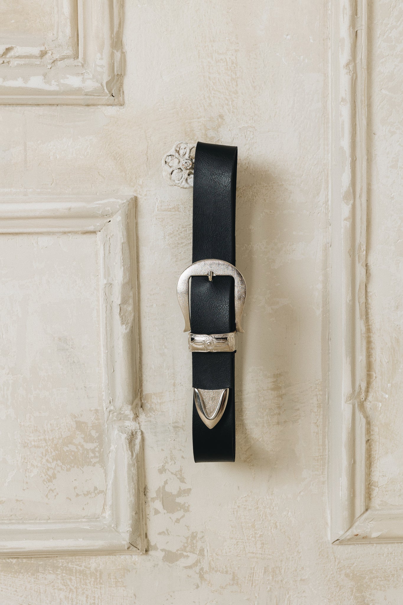 Handcrafted adjustable leather belt with nickel metal buckle.