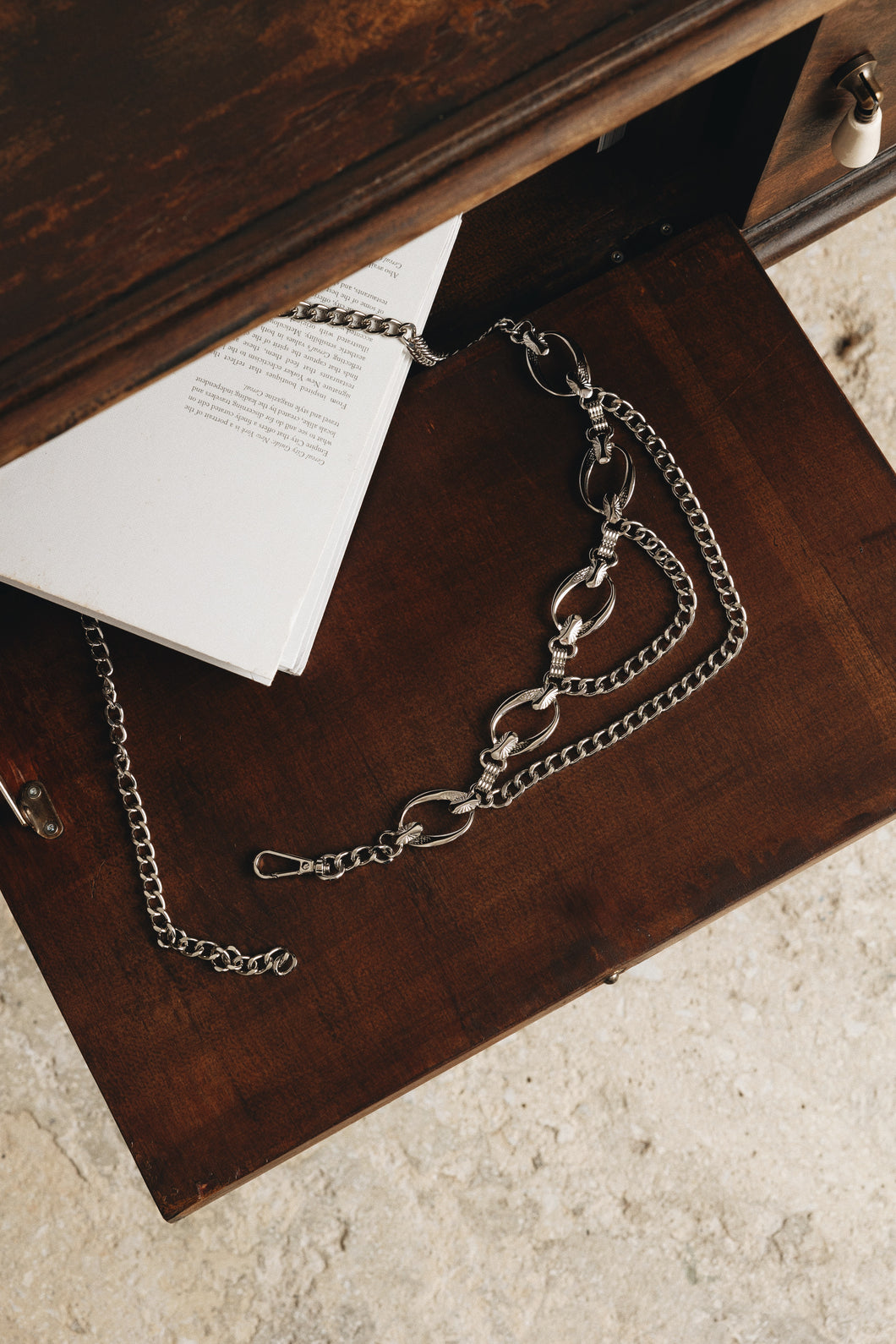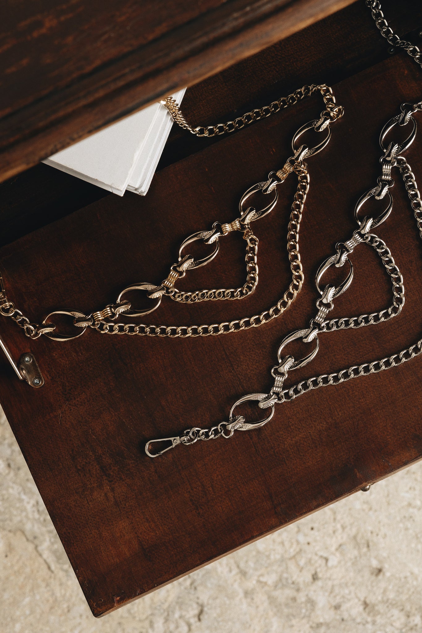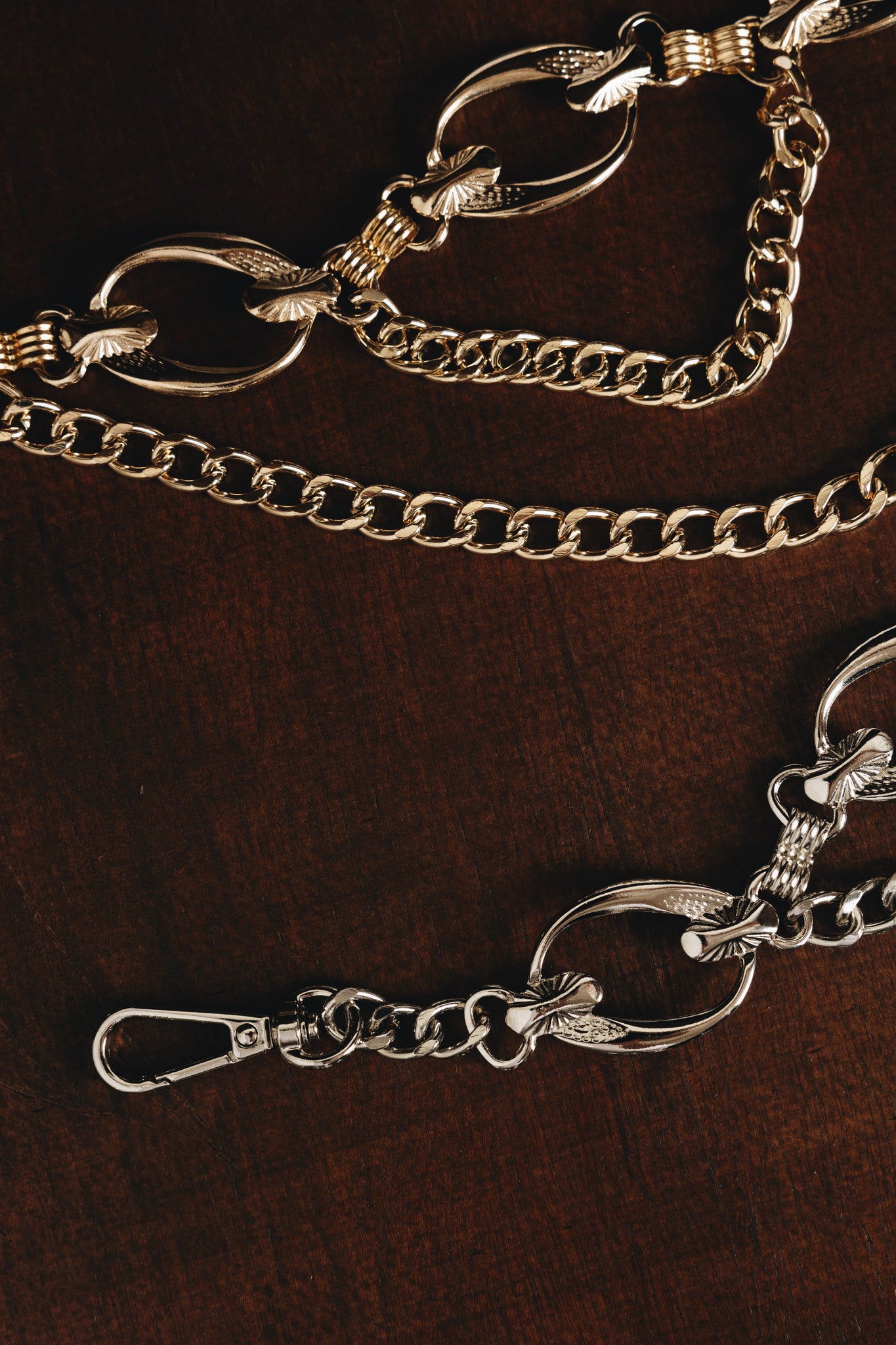 Handcrafted adjustable belt with nickel metal detail and chain.
