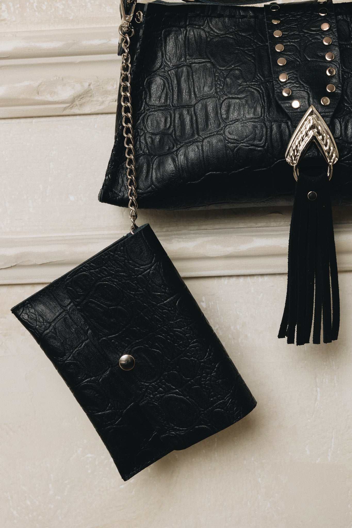 Handcrafted leather bag with nickel metal details. Comes with double strap.  Comes with removable leather wallet.