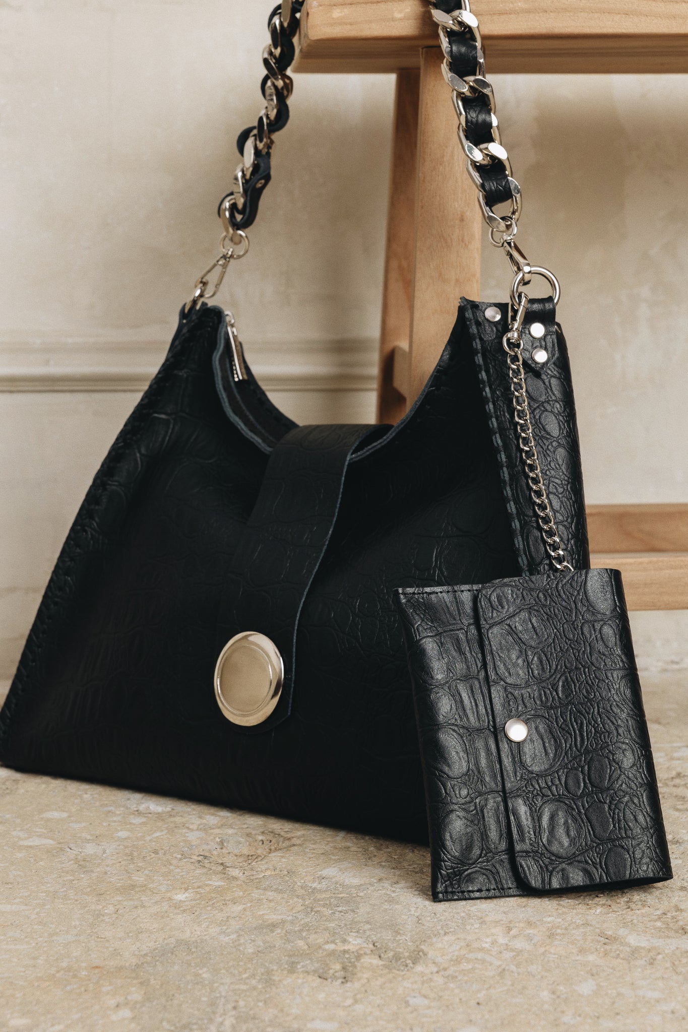 Handcrafted leather bag with nickel metal details. Comes with double strap.  Comes with removable leather wallet.
