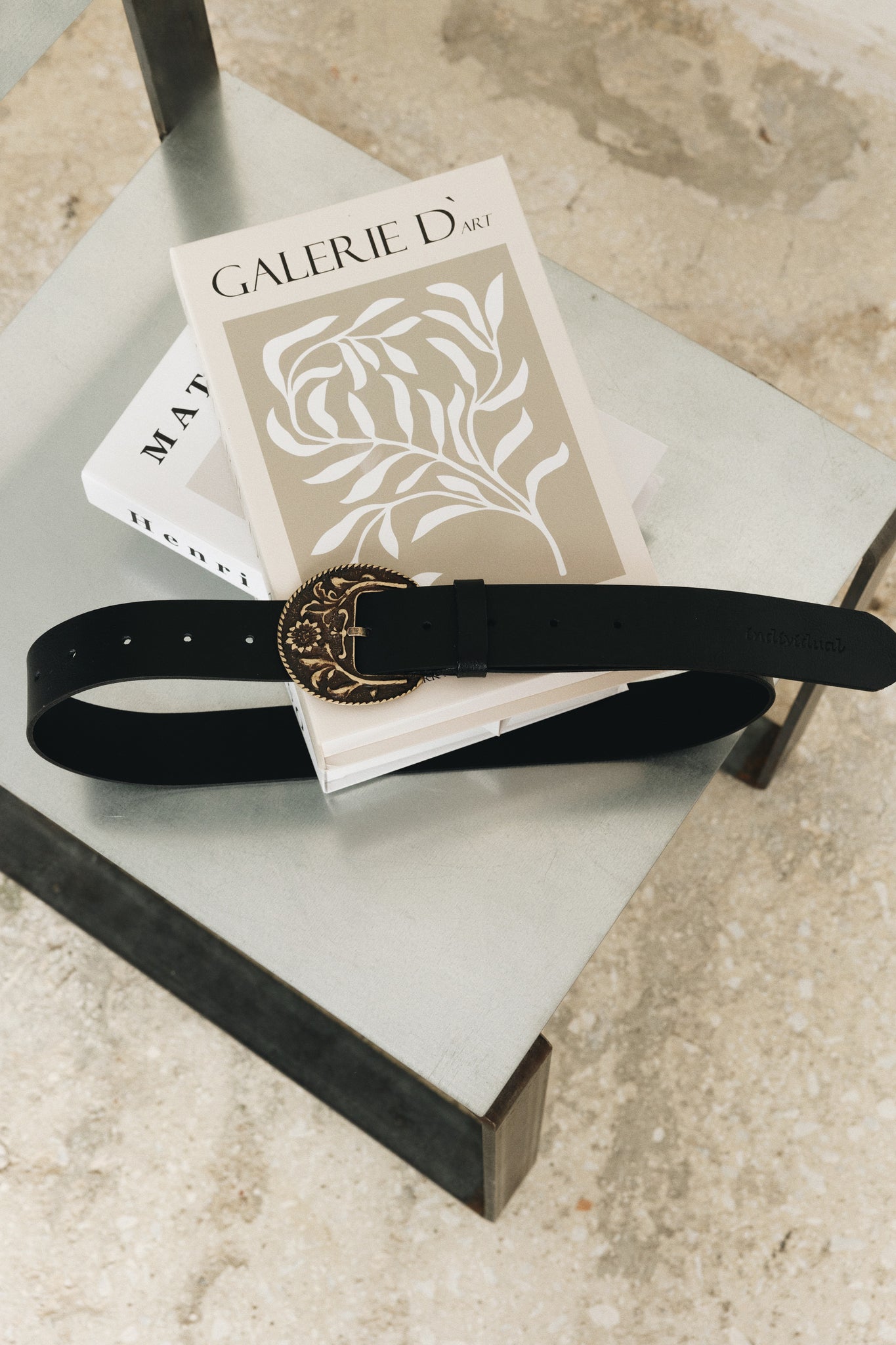 Handcrafted adjustable leather belt with bronze metal buckle.