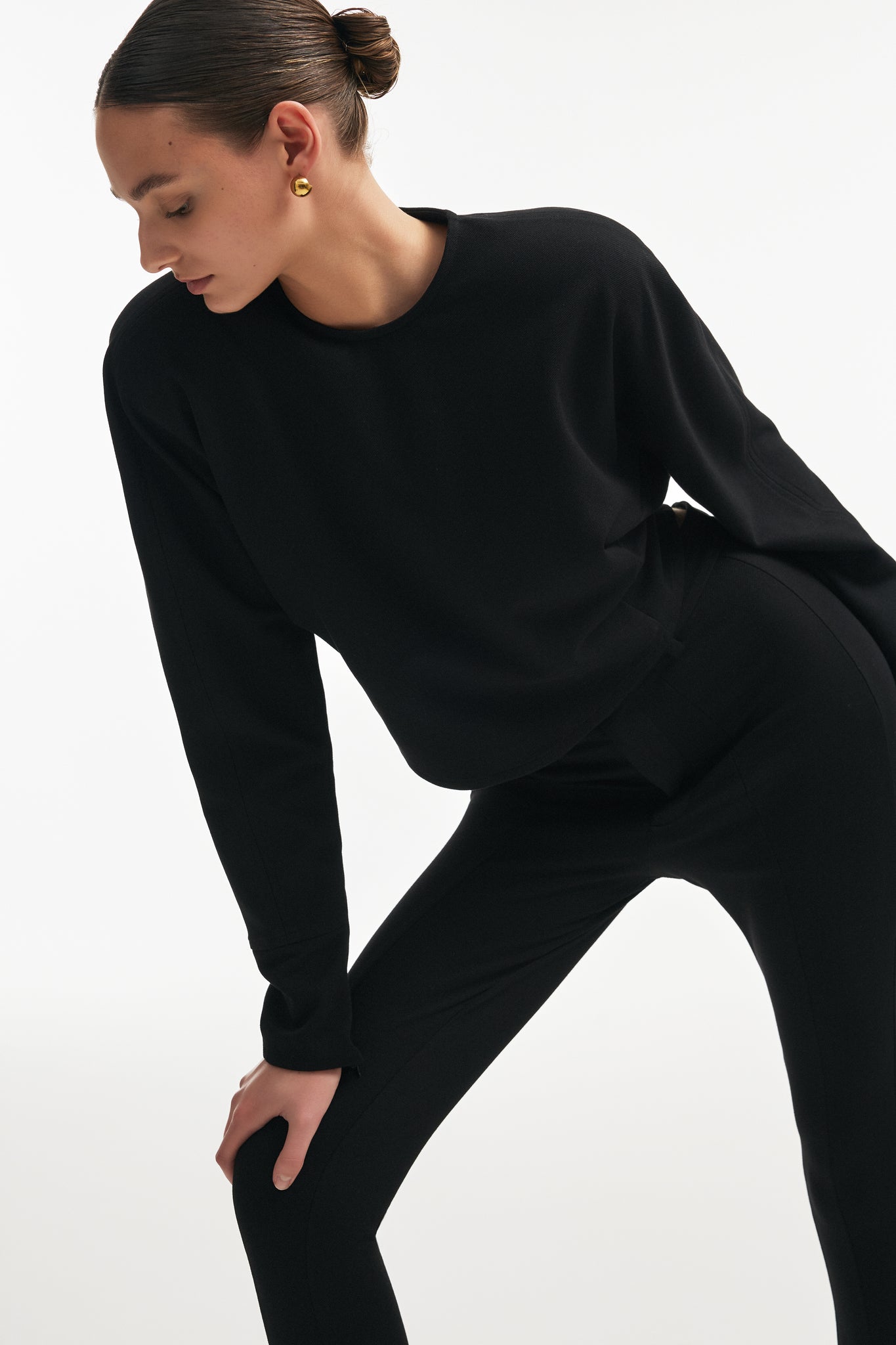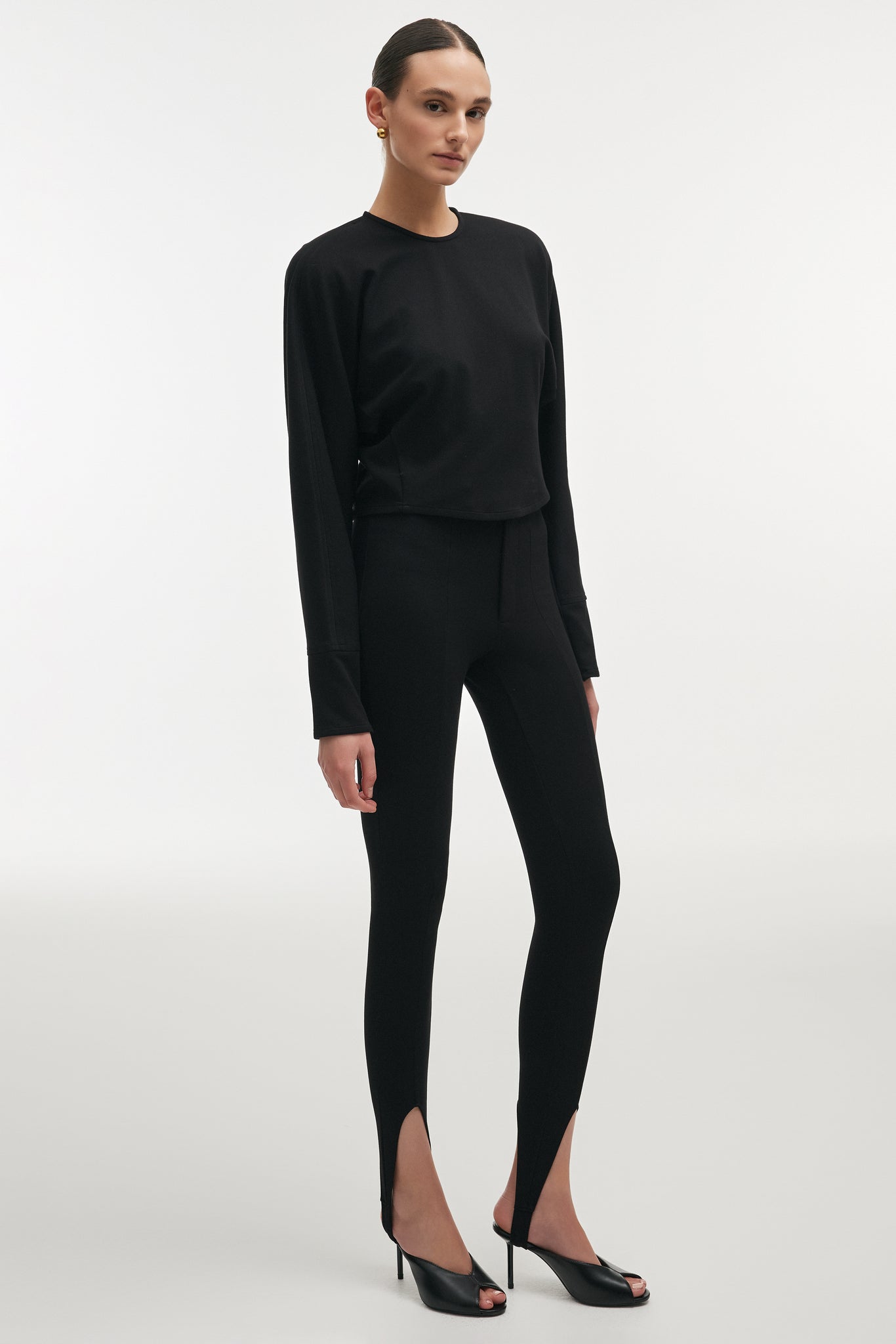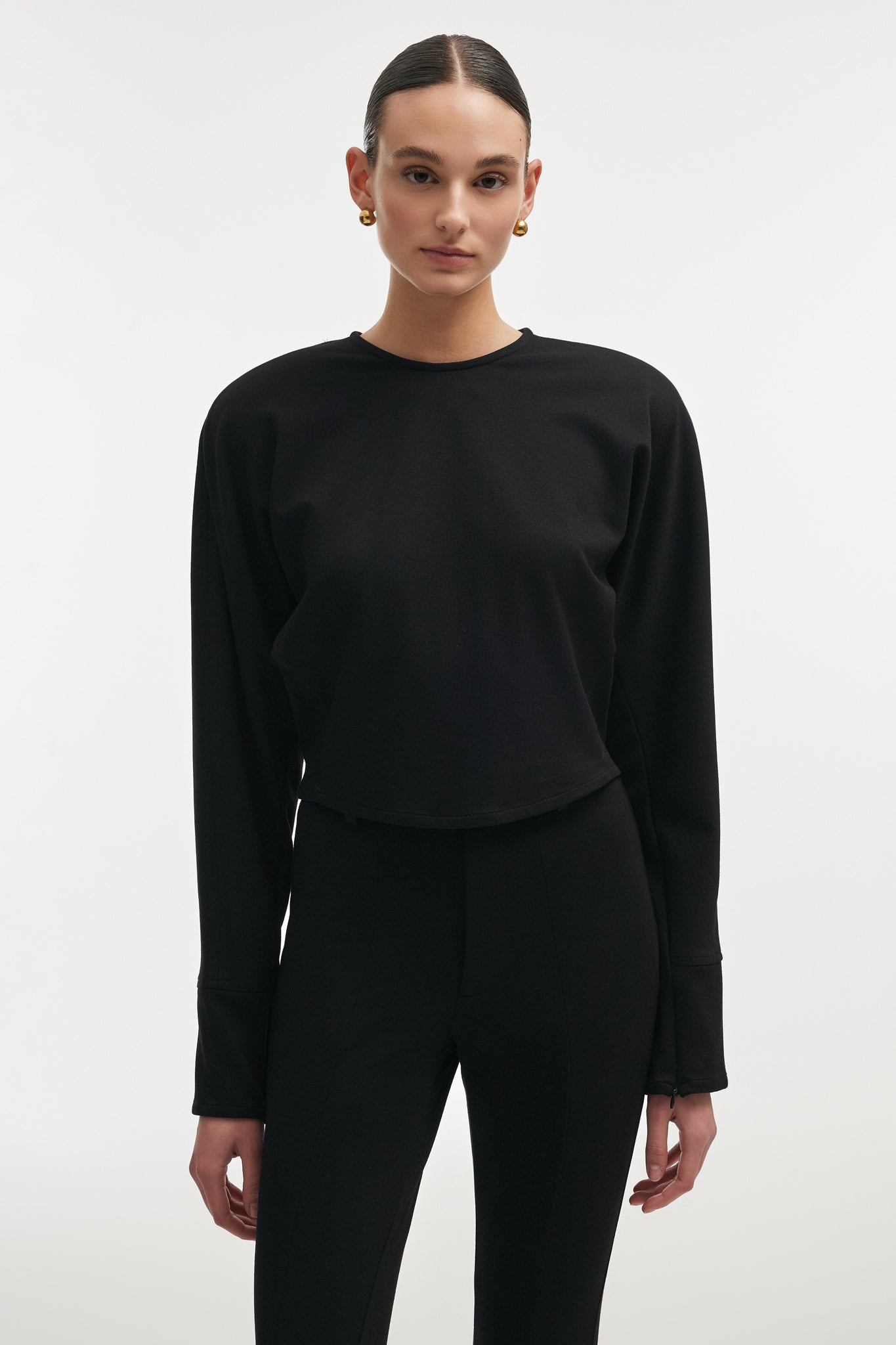 Purity of line, clarity of form. The Fleur Top is defined by its clean silhouette and fluid structure, designed to follow the body with quiet precision. The soft, sculpted shape enhances movement while maintaining a composed, minimal presence. The neckline remains refined and uninterrupted, allowing the proportions to speak without distraction. Long sleeves extend the line of the body, reinforcing its elongated silhouette. Cut to sit close yet effortless, it integrates seamlessly into a considered wardrobe, paired with tailoring, leather, or layered beneath structured pieces.