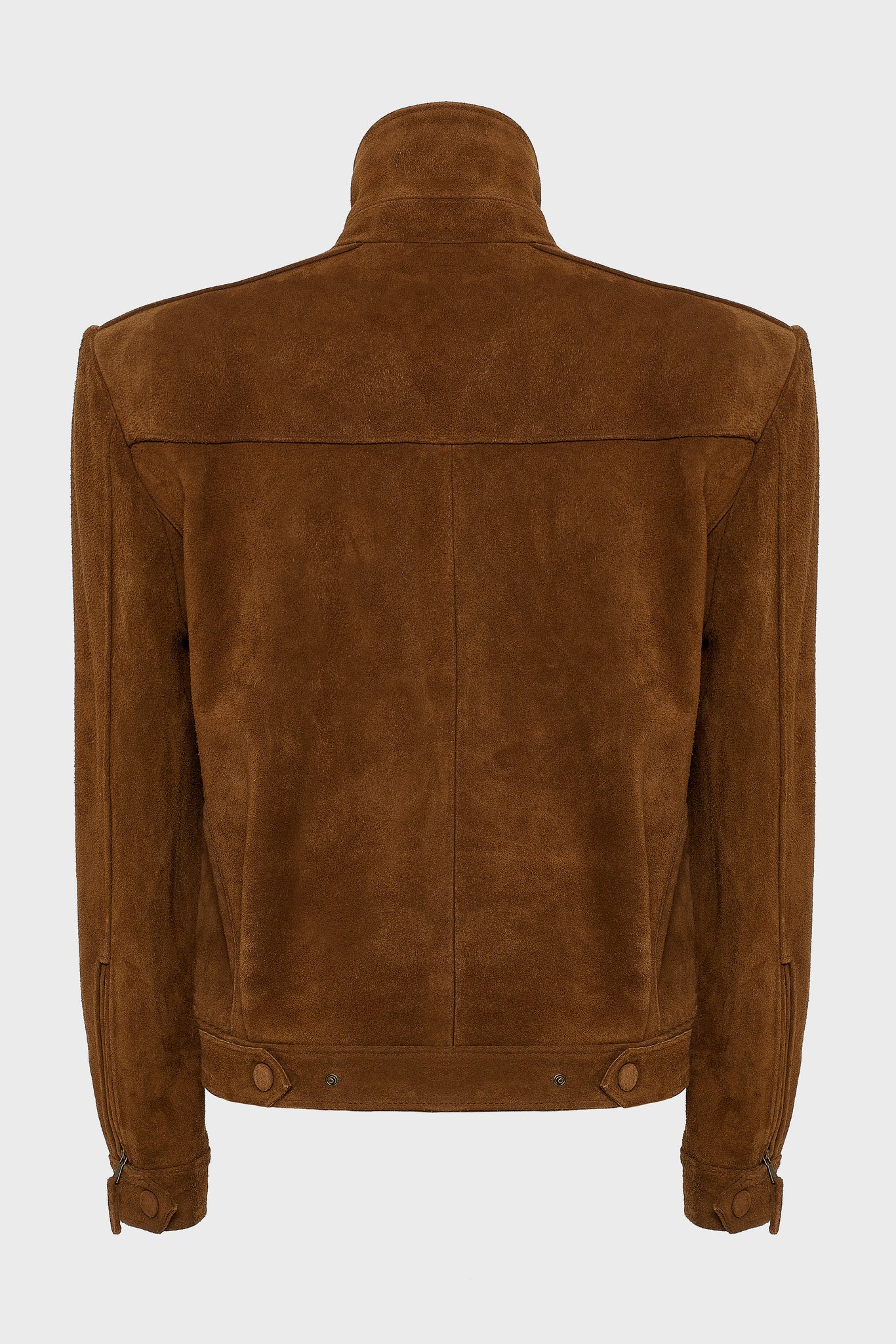 The Guardian jacket is crafted from premium suede leather with a high collar, structured shoulders, and a zip-up front. Snap buttons at the collar, cuffs, and hem allow for a customizable fit, while the tailored cut keeps the silhouette sharp. A versatile piece that works equally well for daytime outings or evening looks.
