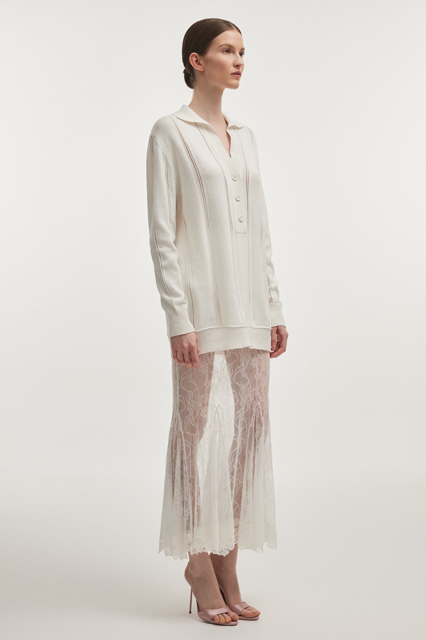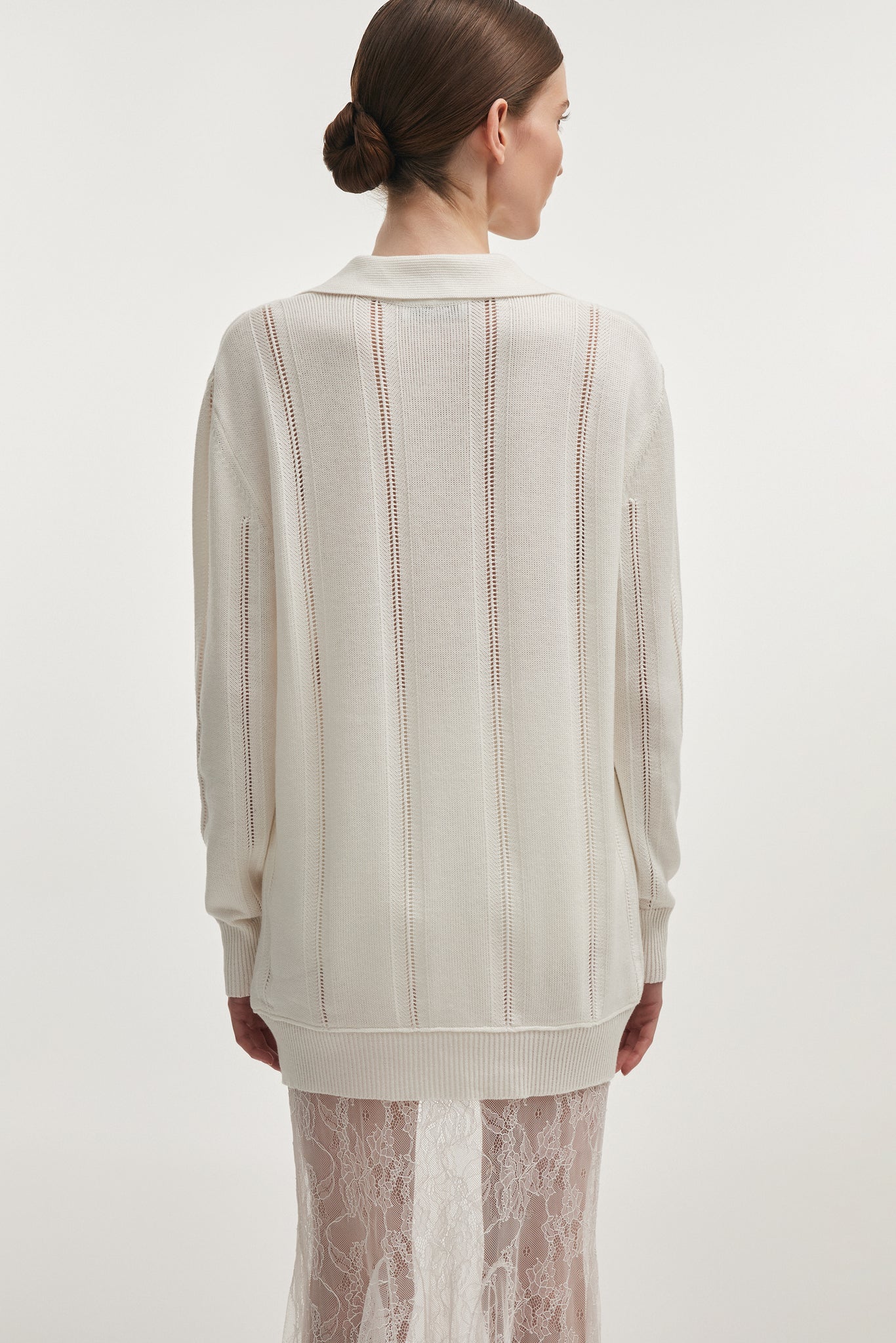 A refined knitted long top designed with understated elegance. Crafted from a soft, lightweight knit, the piece features a relaxed, elongated silhouette with delicate vertical openwork details that subtly structure the garment.