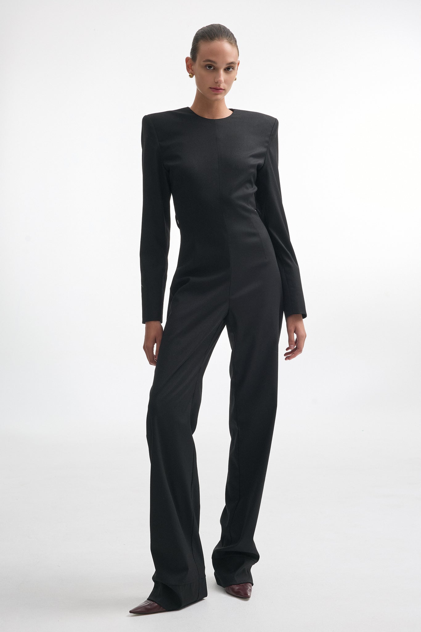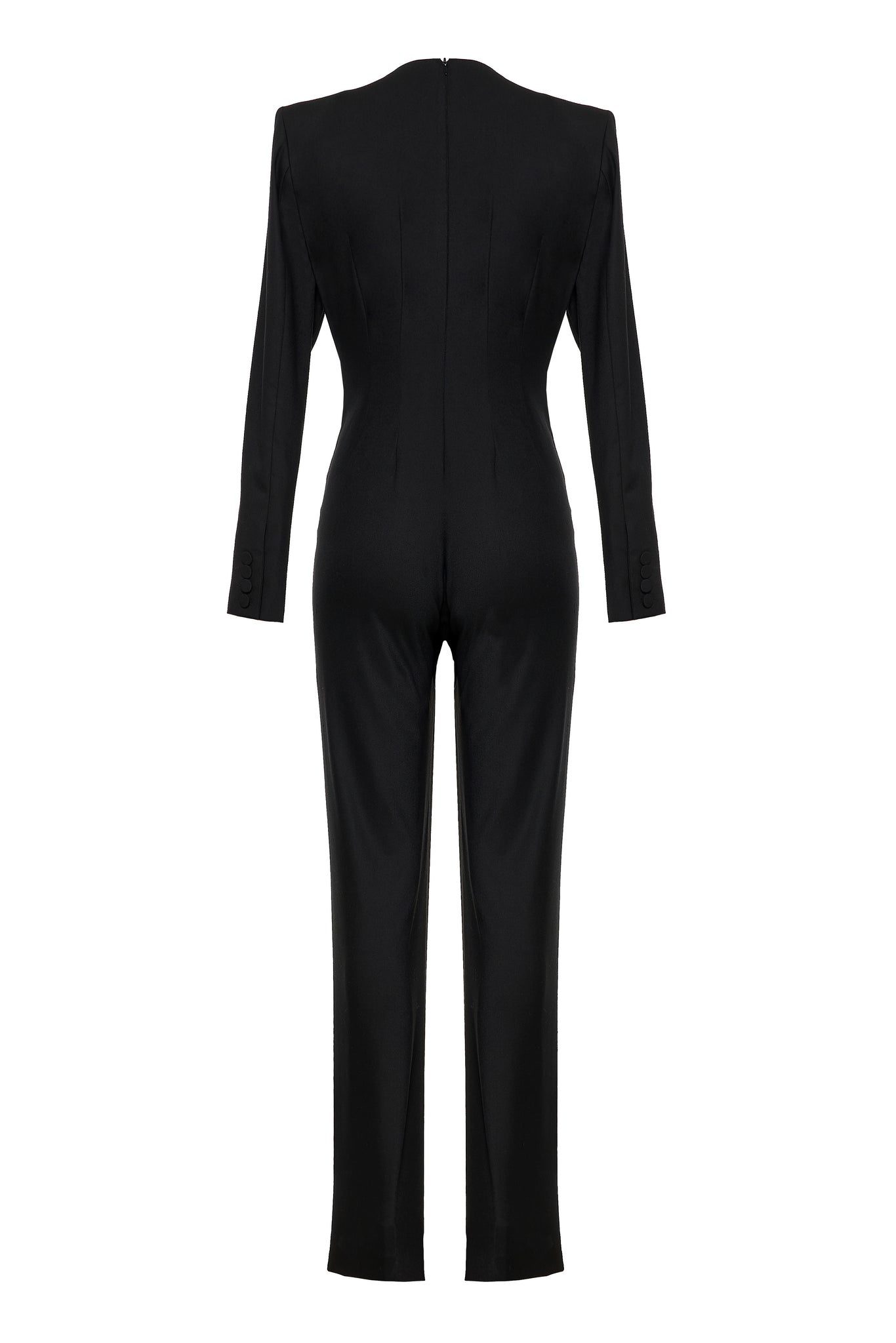 The Night Shift jumpsuit has a tailored, full-length silhouette with sharp shoulders, a fitted waist, and straight-leg pants. It holds its shape while allowing movement, and its bold, modern design makes it ideal for days when you want to feel confident and put-together.