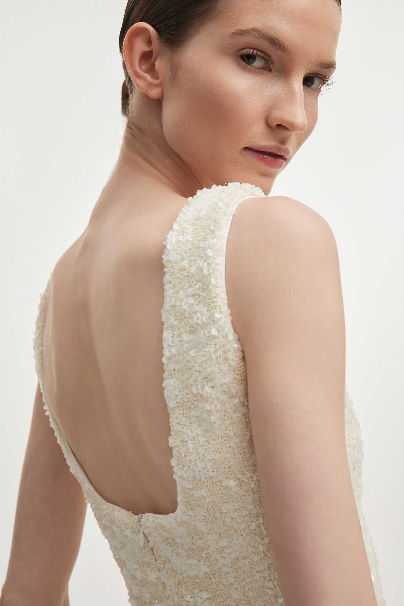 A balance of luminosity and structure. The Petra Dress is crafted from sequin tweed, designed to contour the silhouette with clarity and refinement. The clean, sculpted line is complemented by delicate straps and a defined neckline, creating a composed and confident form. Subtle shimmer moves across the surface with light, while the tailored construction maintains a precise, elongated shape. The slit at the back introduces ease of movement while preserving the dress’s sharp, minimal profile.