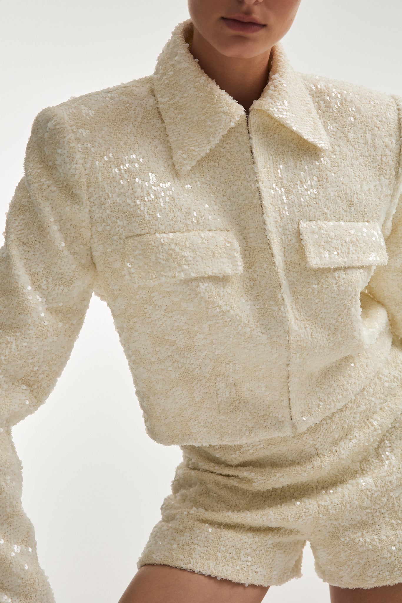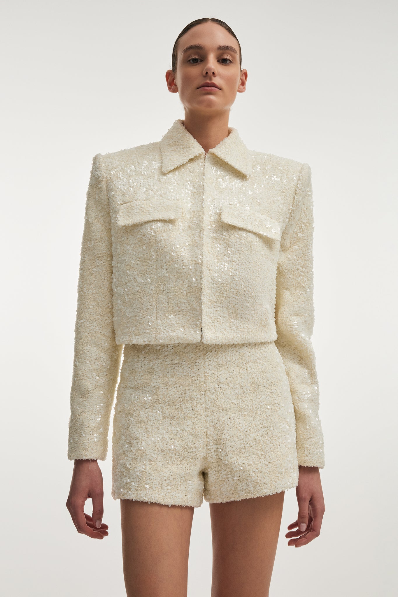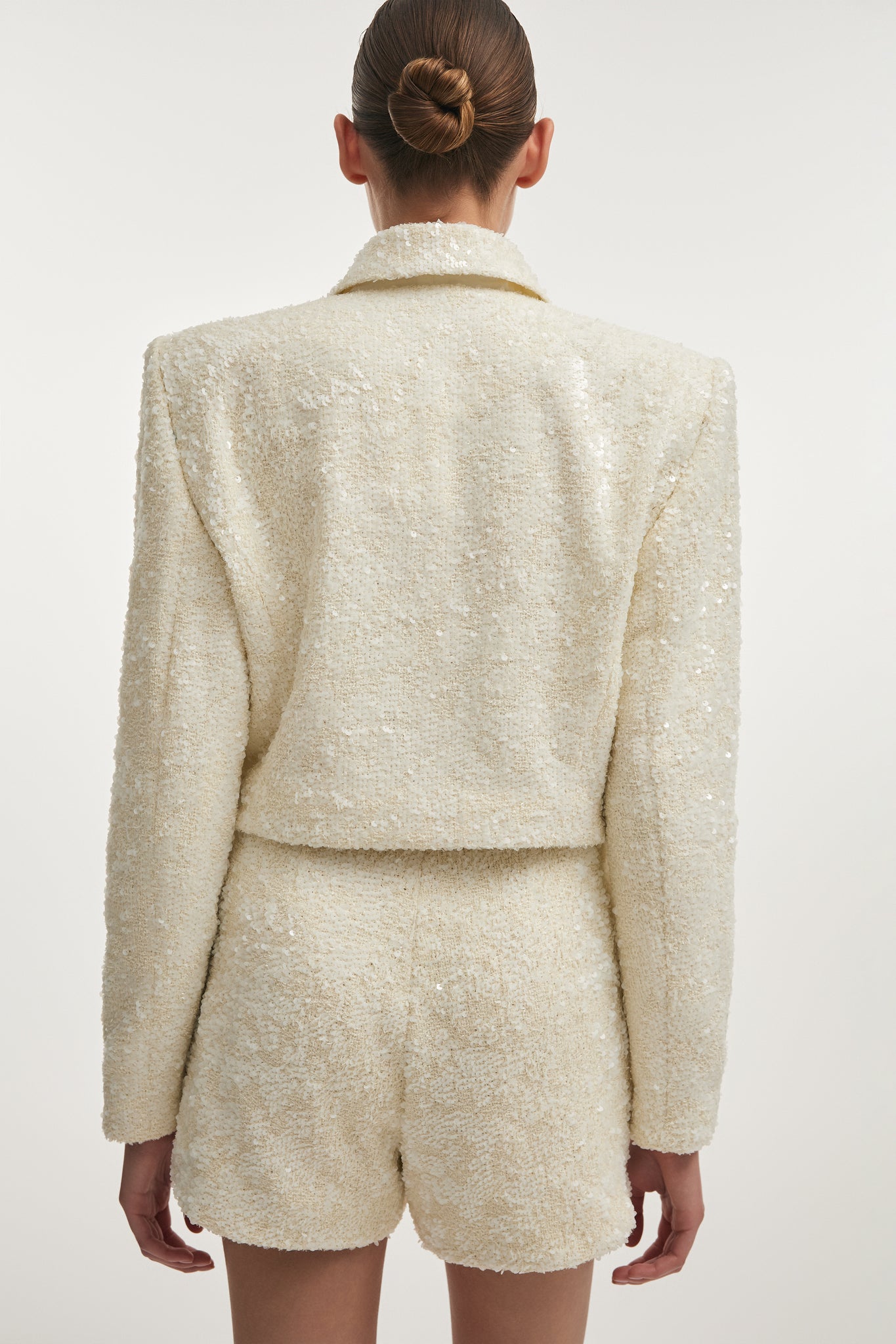 Crafted from sequin tweed, the texture reflects light subtly, adding a soft luminosity while maintaining a polished feel.