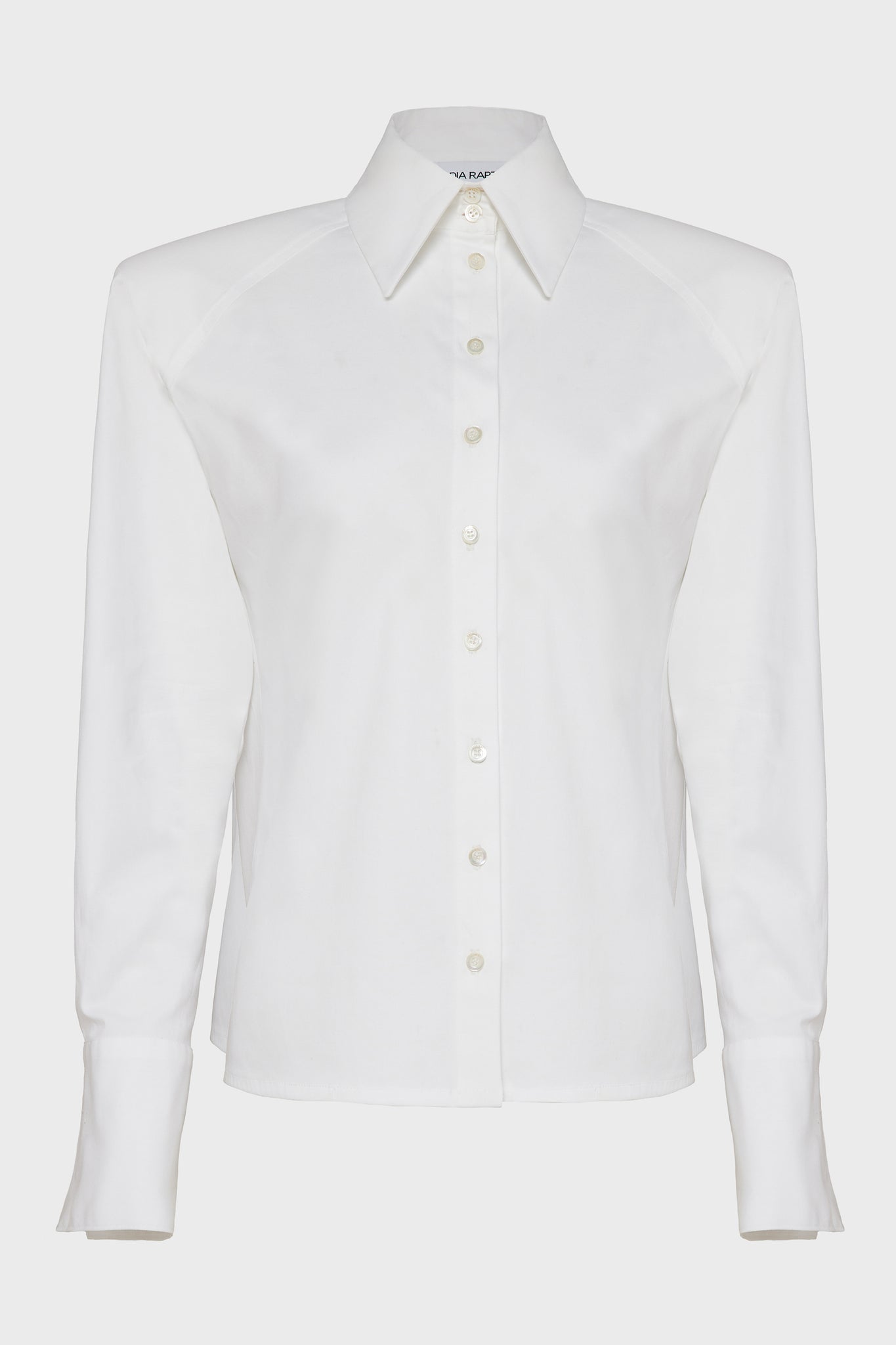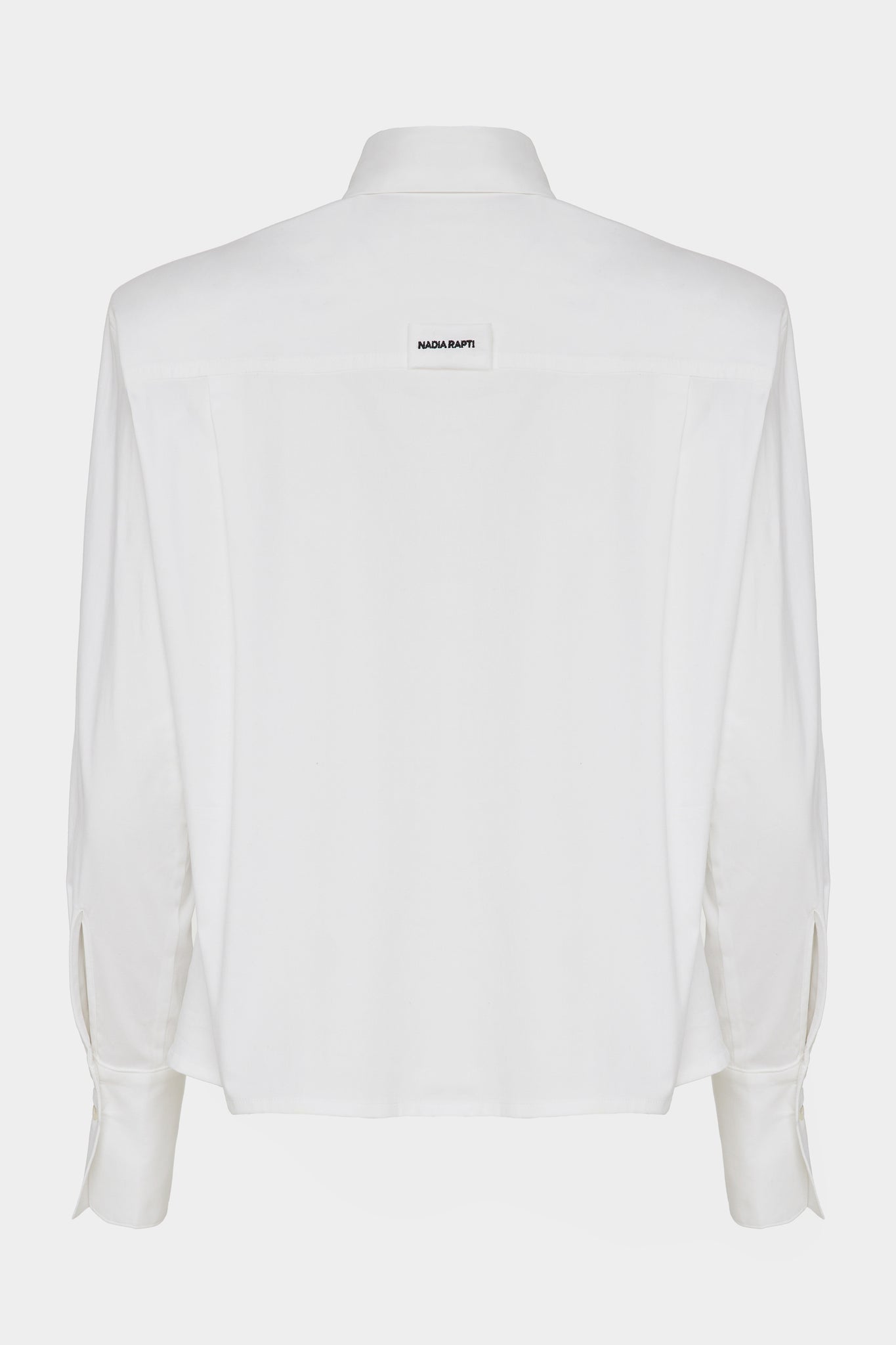 A refined poplin shirt defined by its clean lines and soft structure. Crafted from a crisp cotton blend, the silhouette is tailored yet relaxed, offering a balance between precision and ease. The classic collar and concealed detailing enhance the minimal aesthetic, while elongated cuffs add a subtle, directional touch.The clean, refined tone introduces a sense of quiet femininity without compromising the modern feel of the piece.