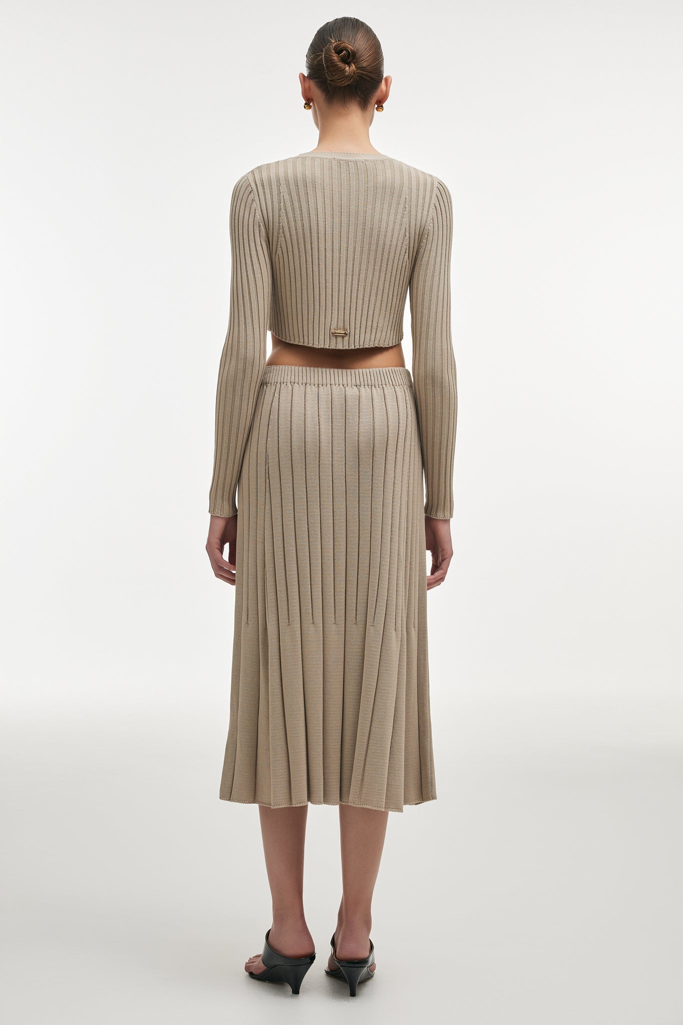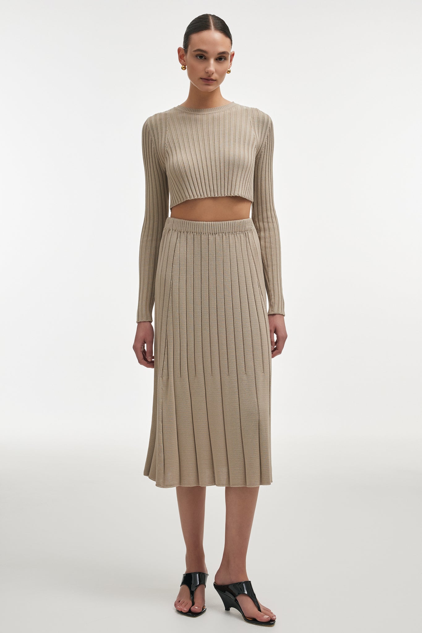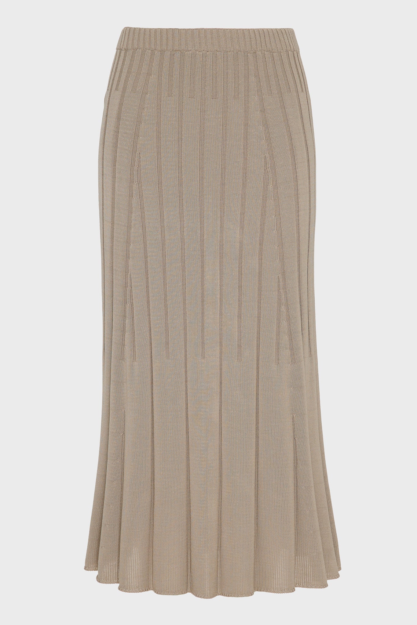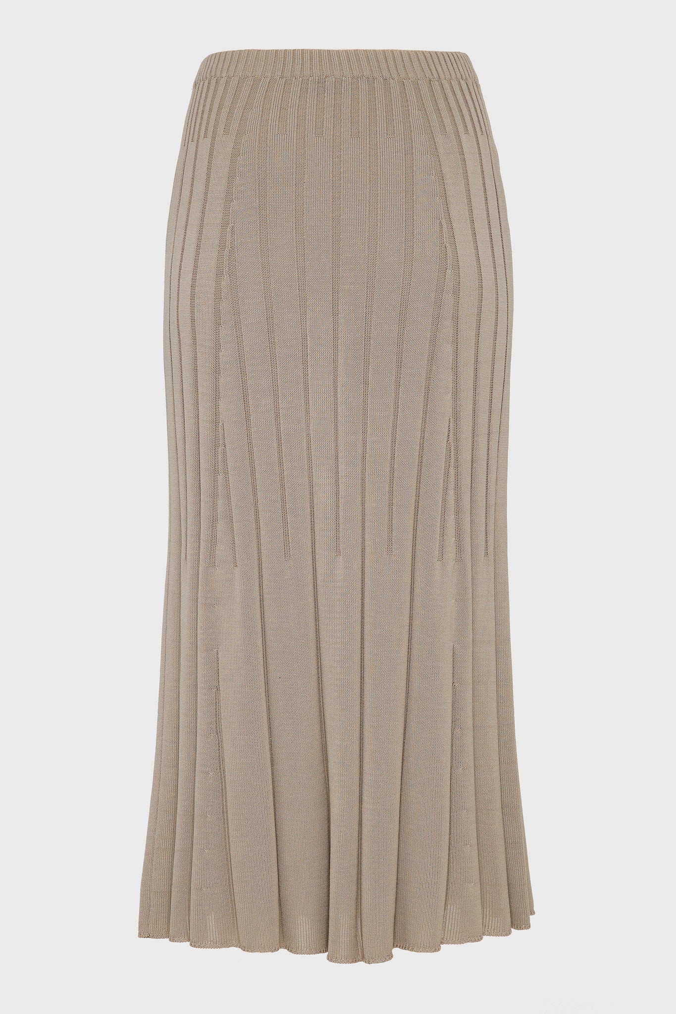 A sleek knitted skirt designed to enhance movement and silhouette with understated elegance. Cut in a long, streamlined shape, it follows the body naturally while allowing ease and fluidity with every step. Crafted from viscose rib fabric, it feels soft and lightweight on the skin, offering comfort, stretch, and a refined drape.
