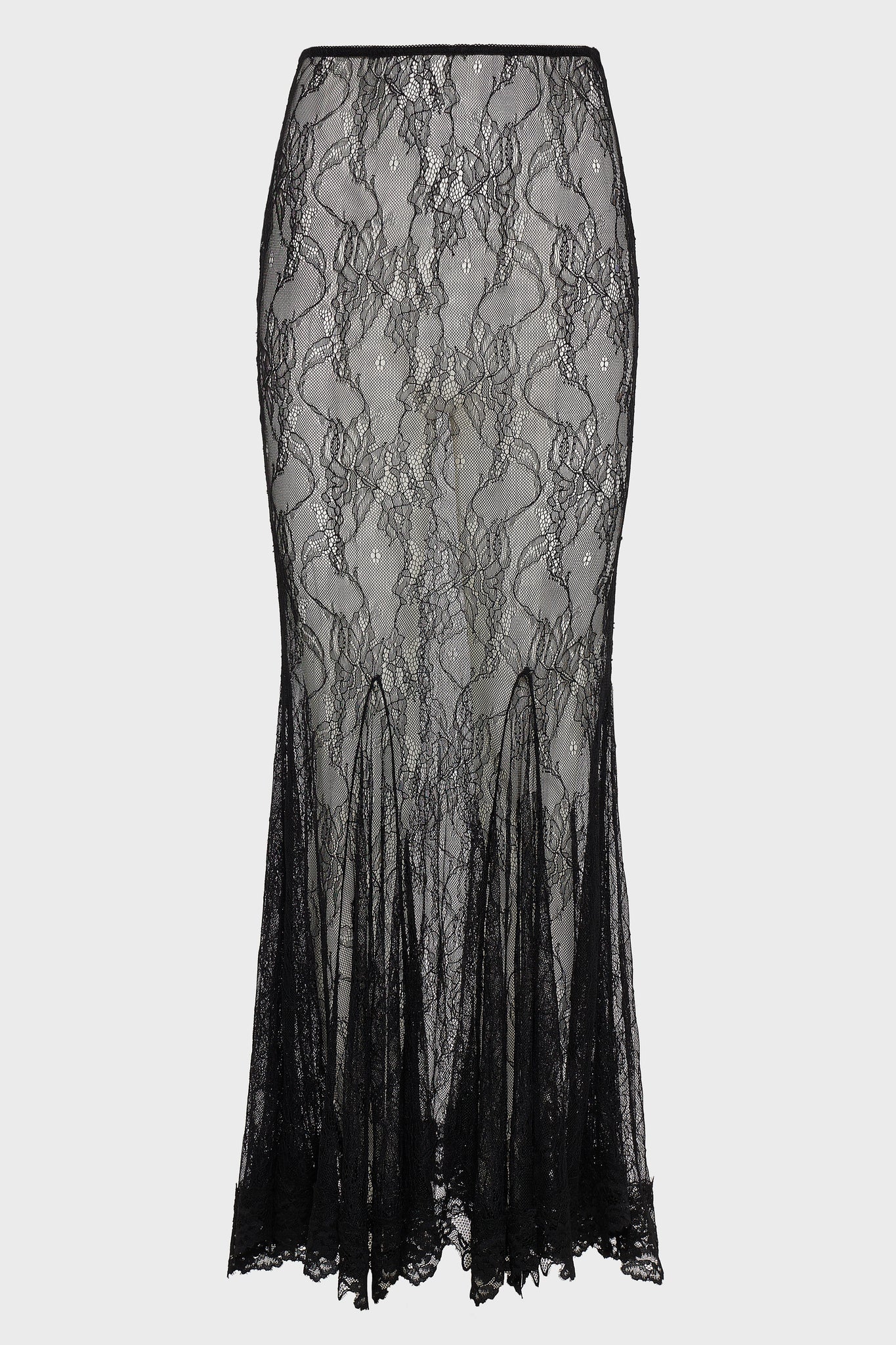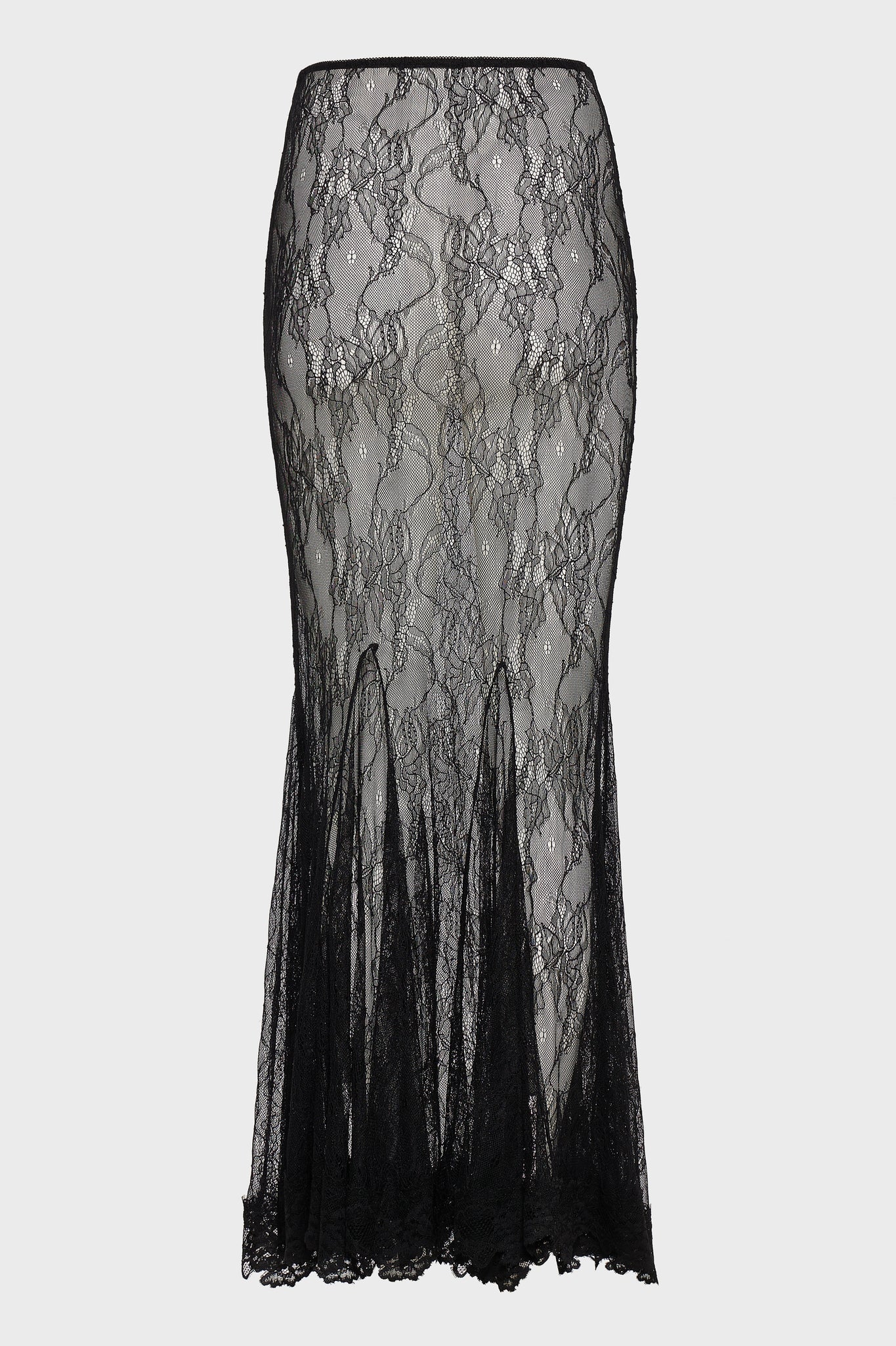 A refined lace skirt that combines delicacy with a modern, elongated silhouette. Crafted from soft lace, the design follows the body closely before subtly flaring at the hem, creating movement and lightness. The semi-sheer texture introduces a sense of quiet sensuality, while the clean waistband keeps the look minimal and balanced. The fluid finish enhances the interplay between transparency and structure.
