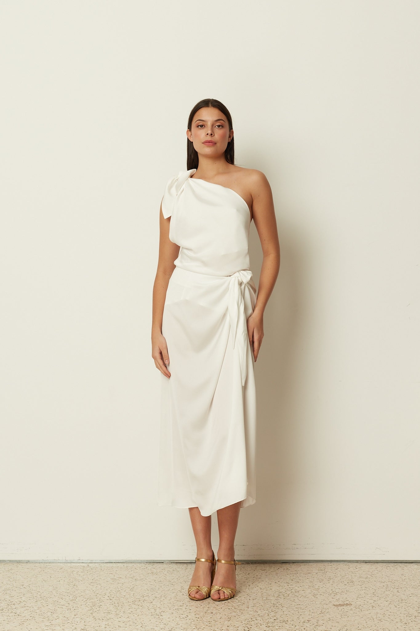 A modern take on the sarong skirt by ckontova, designed to wrap and tie at the waist for a flattering, adjustable fit. Cut in a fluid fabric with an elegant drape, it features a statement side knot and a soft overlay panel that creates movement and a subtly asymmetric finish. Style it with the matching tops for an elevated occasion set, or pair it with a simple tank for effortless summer evenings.