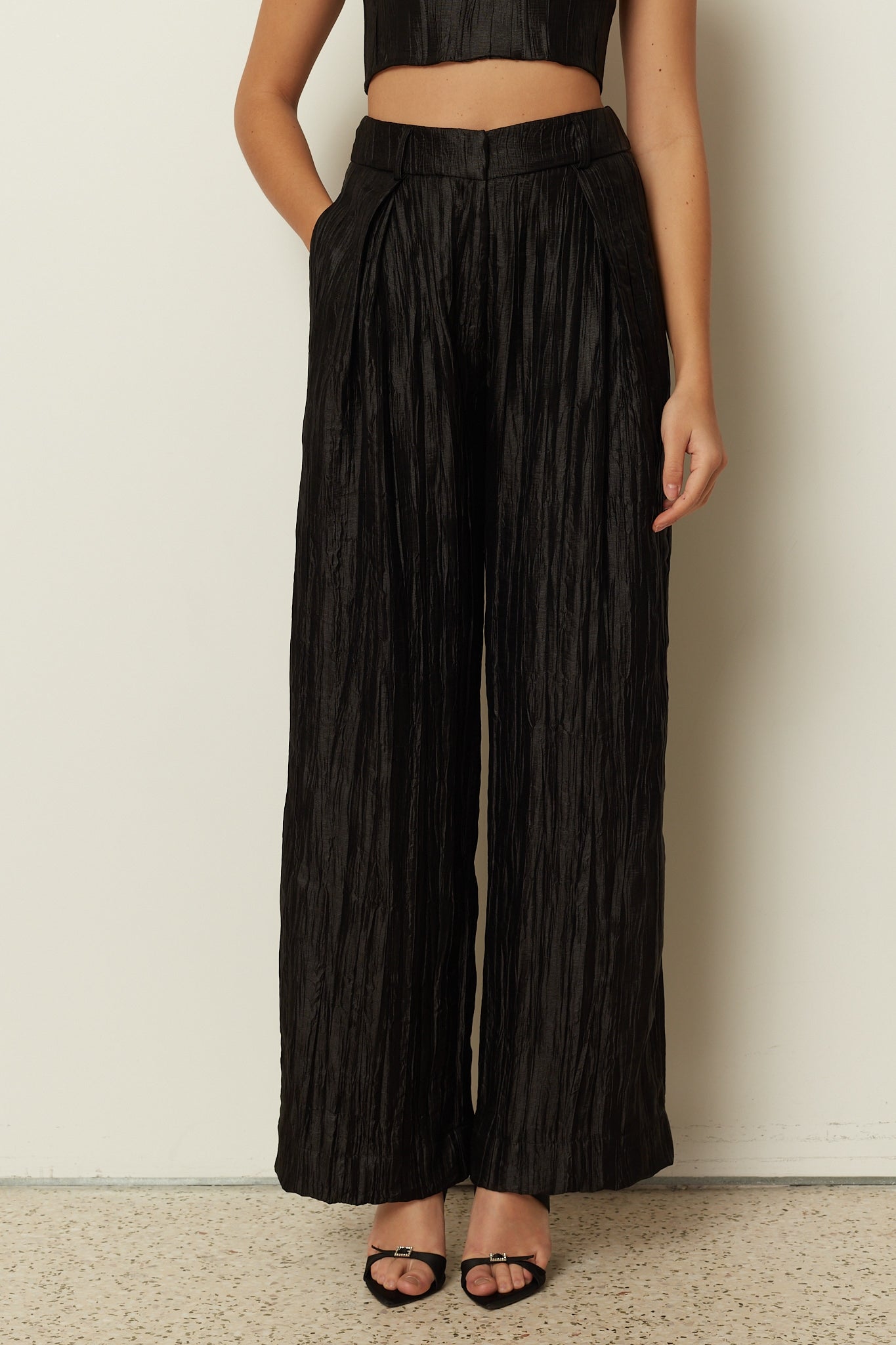 BLACK METALLIC PLEATED WIDE LEG PANTS