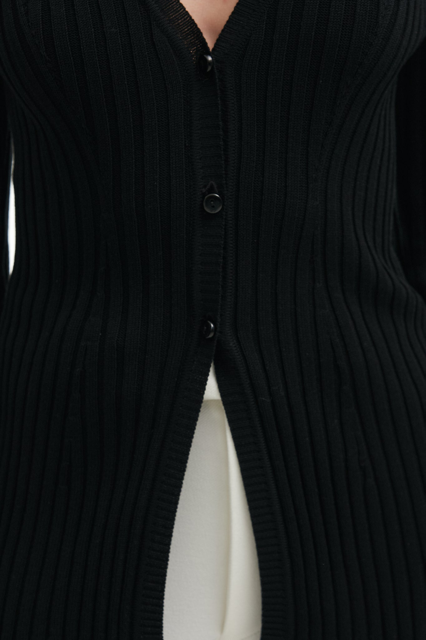 A refined knitted cardigan designed for effortless everyday elegance. Cut in a clean, fitted silhouette with long sleeves, it follows the body naturally while maintaining a sleek and structured appearance. Crafted from viscose rib fabric, it feels soft and smooth against the skin, offering comfort, flexibility, and a polished finish.