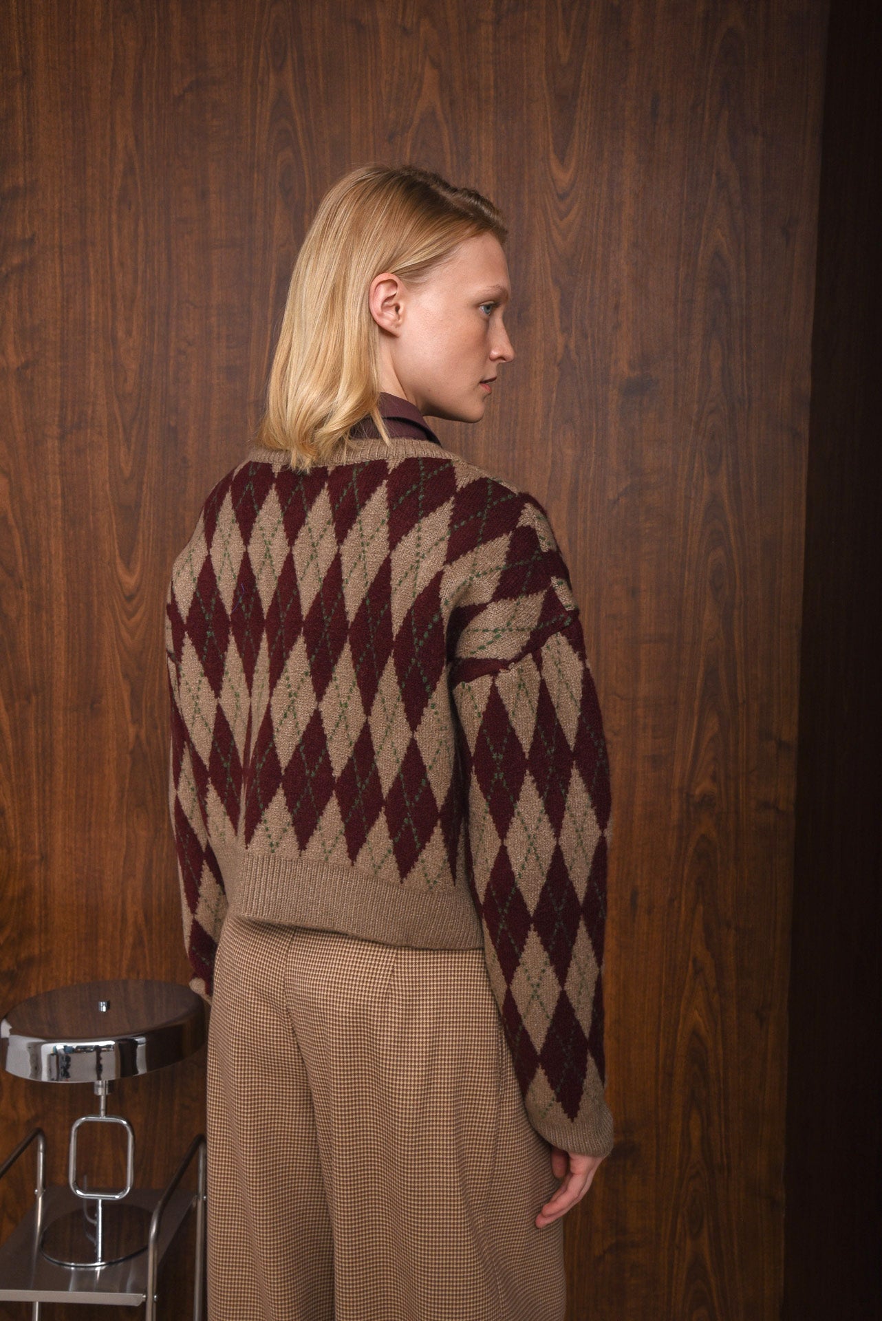The Balance pullover features a classic argyle pattern, a round neckline, and long, relaxed sleeves. Its fit is slightly cropped with a ribbed hem and ribbed cuffs for structure. Soft and warm, it layers easily over shirts or tops. A simple, timeless knit designed for everyday comfort and style.