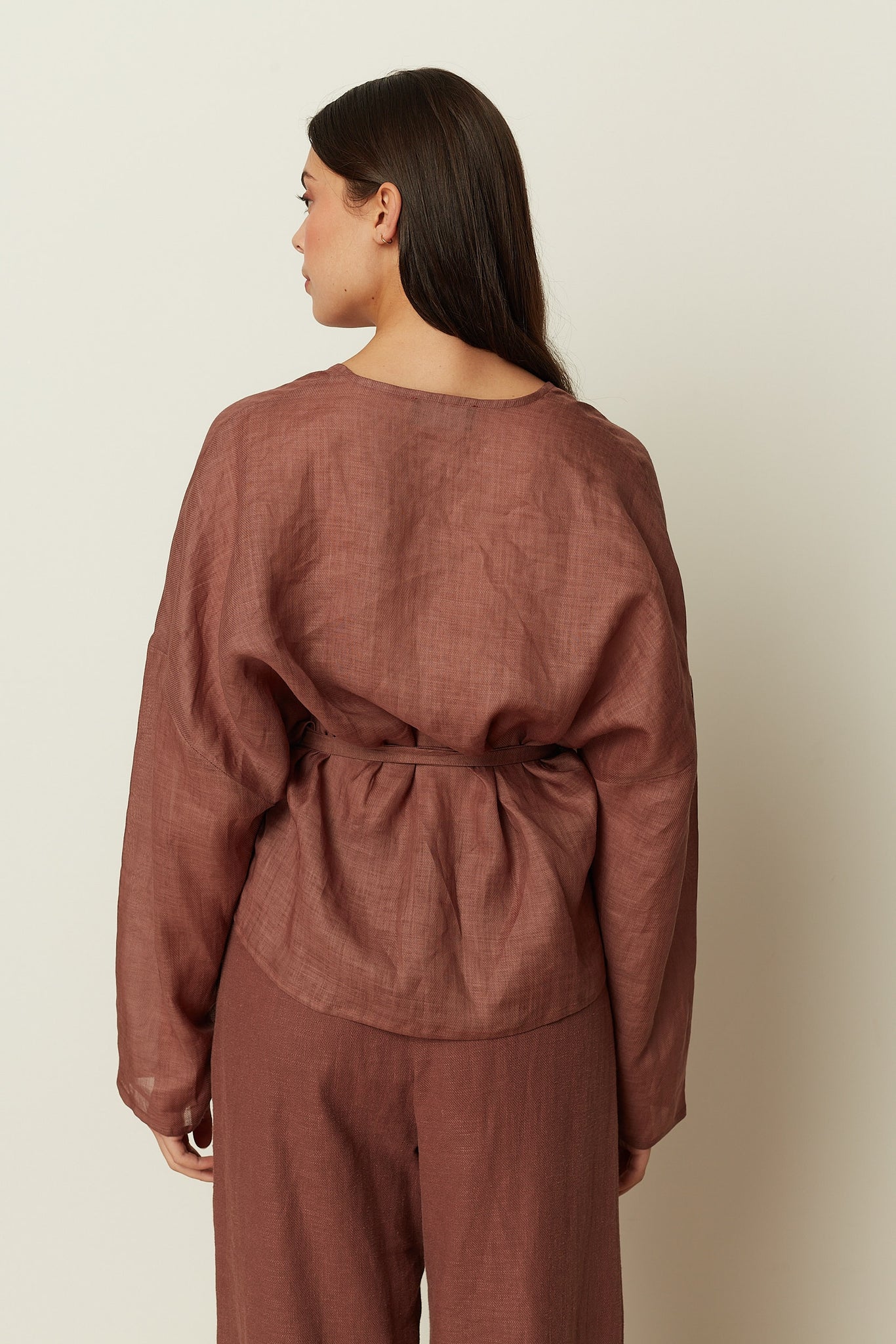A relaxed kimono-inspired wrap top by ckontova, crafted in breathable ramie with a natural, linen-like texture. Designed with a soft V neckline, an easy draped silhouette and long sleeves, it ties at the side to define the waist while keeping the fit effortless. Lightweight and airy, it’s an ideal warm-weather piece, wear it with the matching shorts for a refined resort set, or pair it with tailored trousers for elevated everyday dressing.