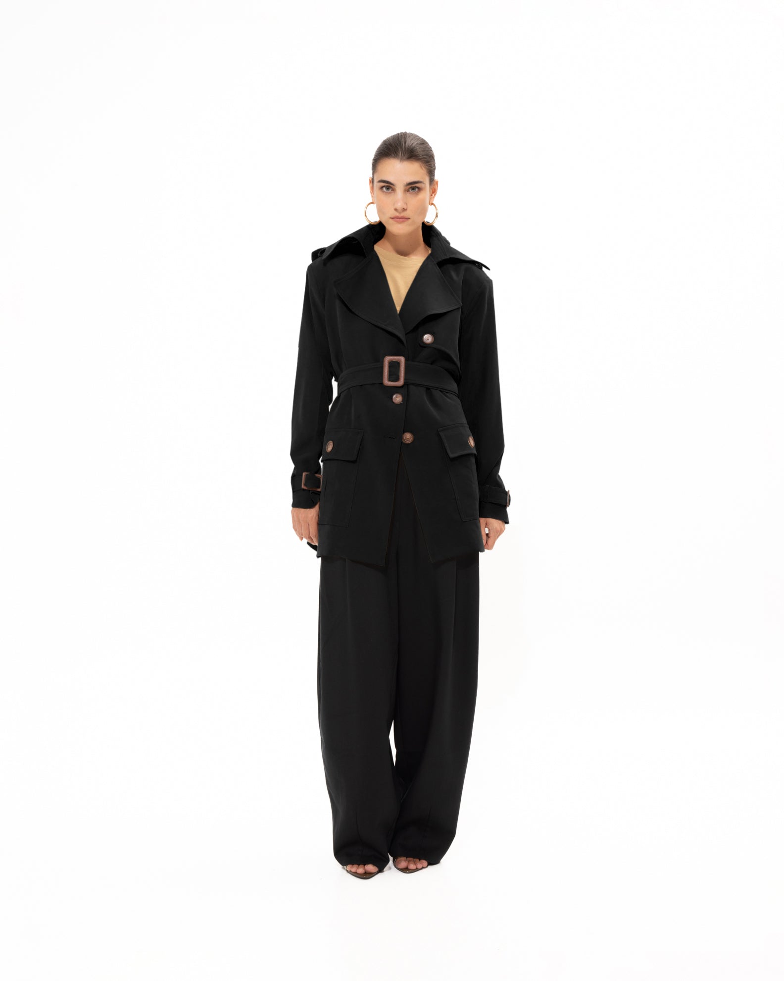 This classic double-breasted trench jacket is designed for both style and functionality.