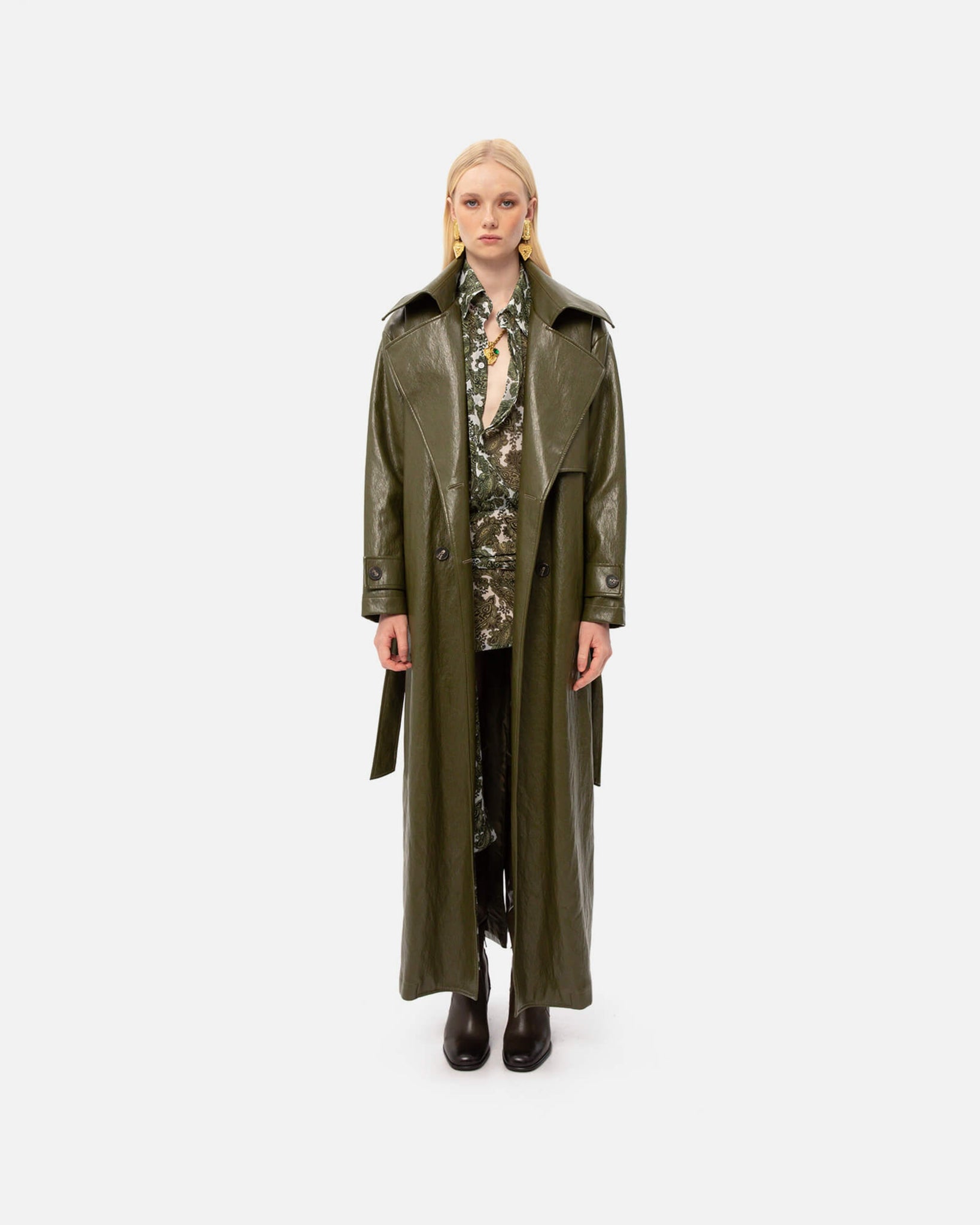 A sleek faux-leather trench in deep khaki, offering a modern take on