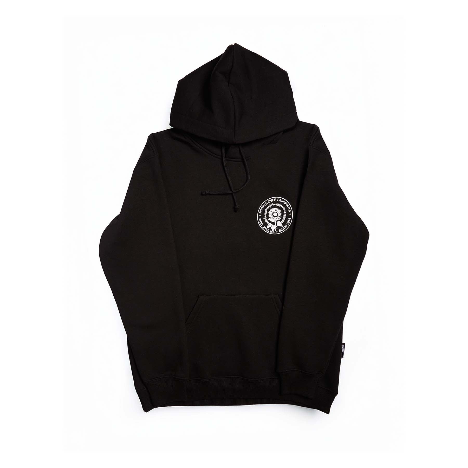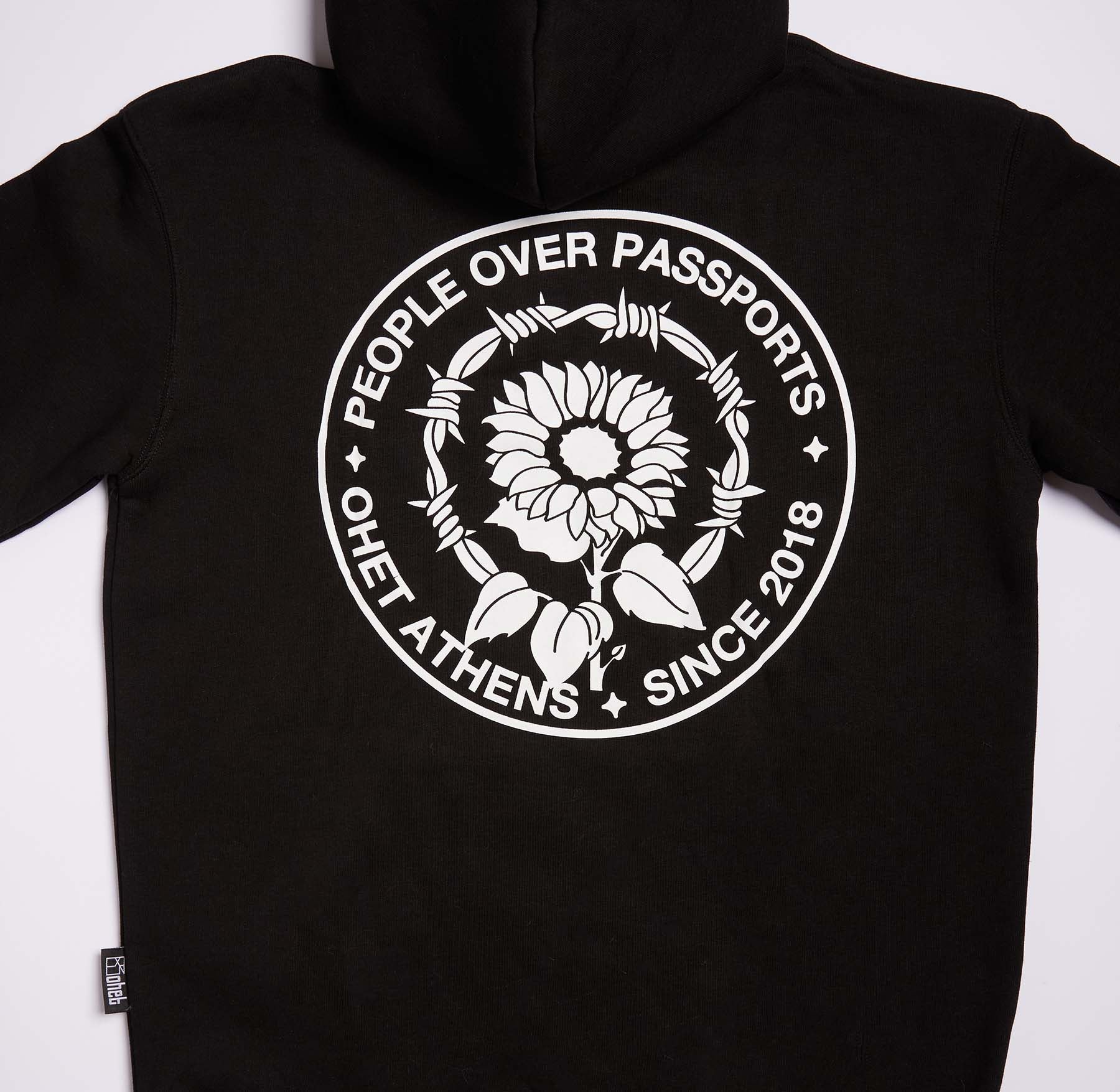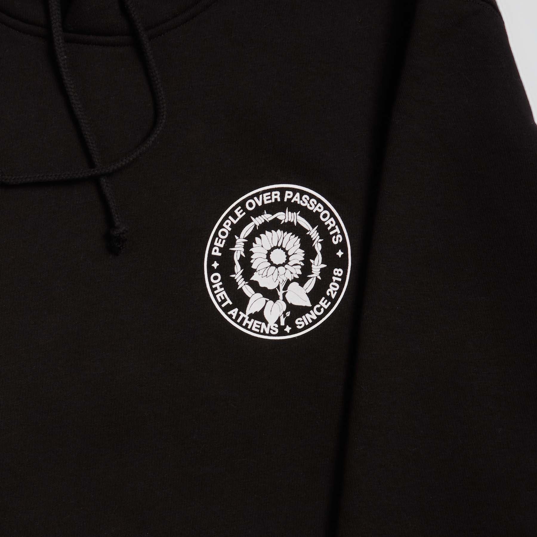 Black Hoodie “People Over Passports” from the Hotel OHET collection — a statement against borders.
