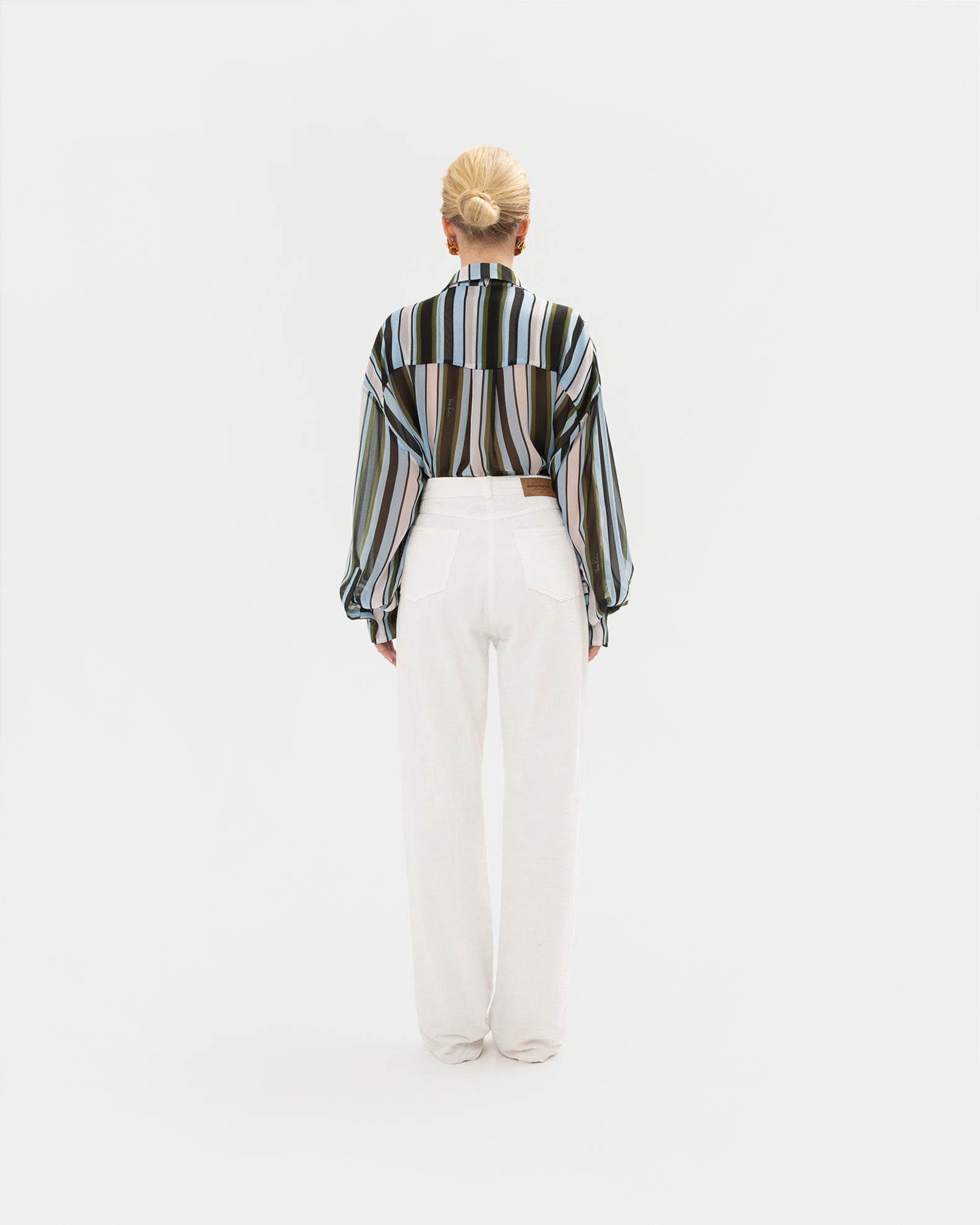 Crisp creme jeans with a straight-line cut for a clean, timeless silhouette.