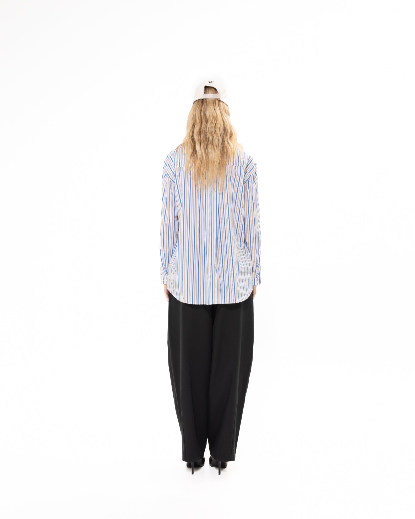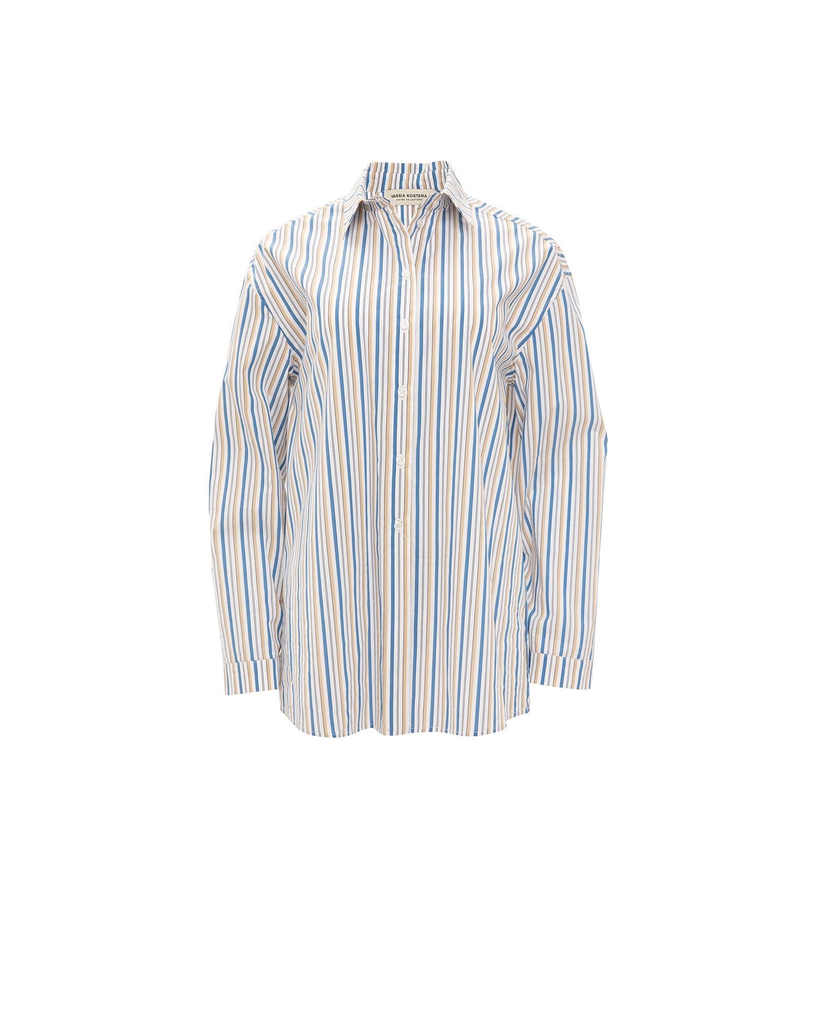 A shirt in sky blue, camel, and white stripes for a fresh, contemporary look.