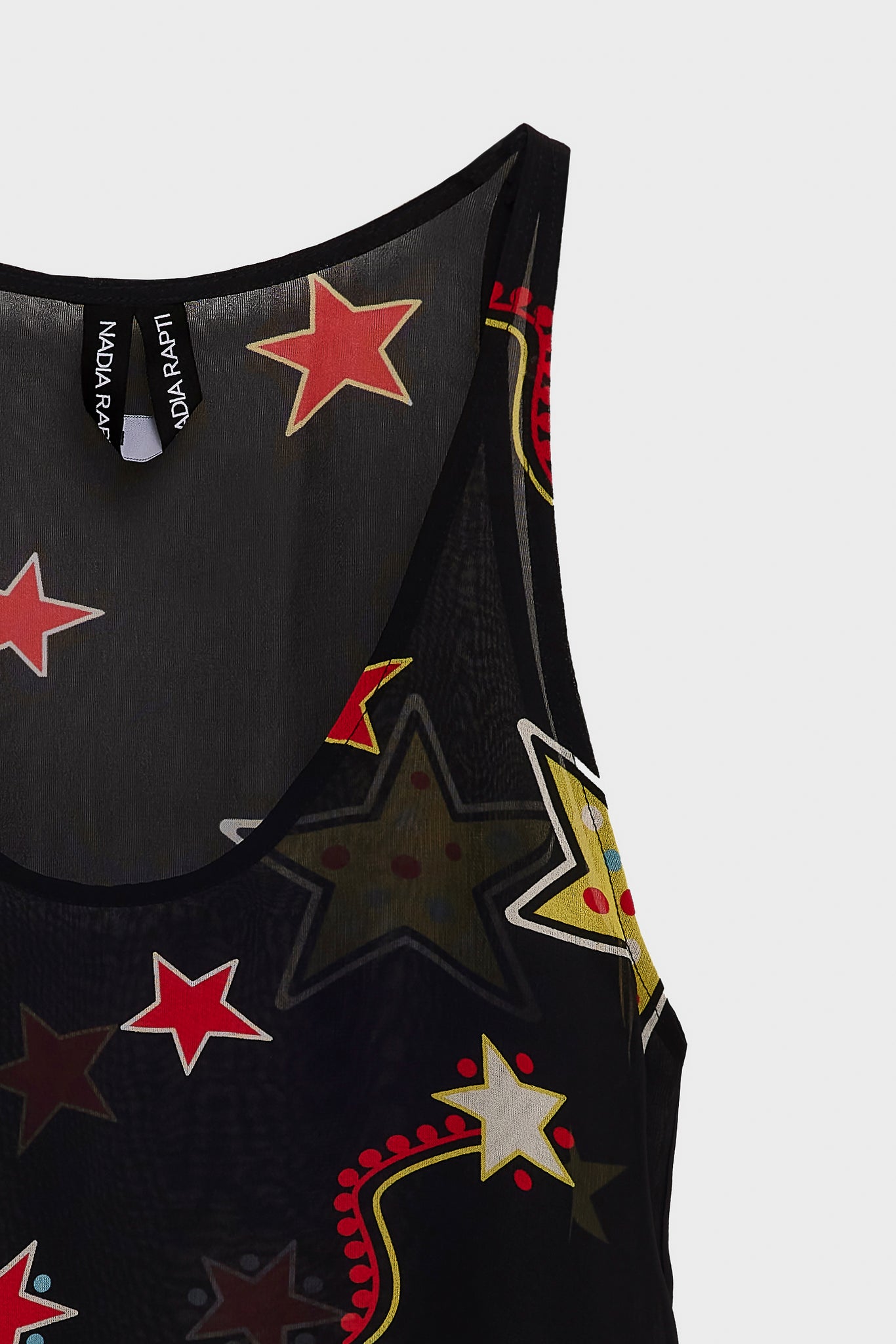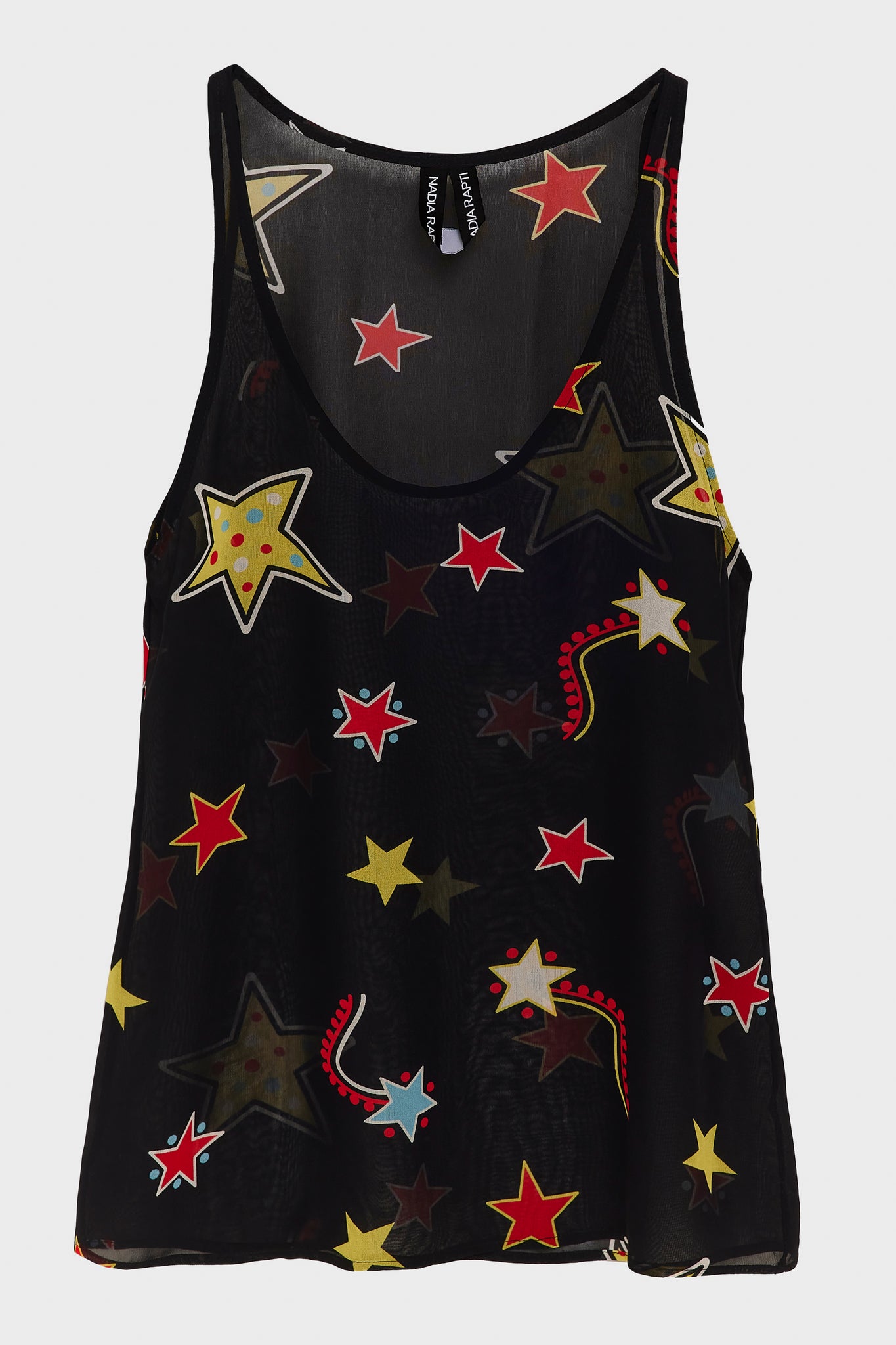 A lightweight sleeveless top crafted from semi-sheer fabric, patterned with bold star motifs. Its relaxed silhouette and fluid drape make it effortless to wear. Layer it over tailoring for contrast or pair it with denim for a more casual mood. Subtle yet striking, it brings a graphic edge to everyday dressing.