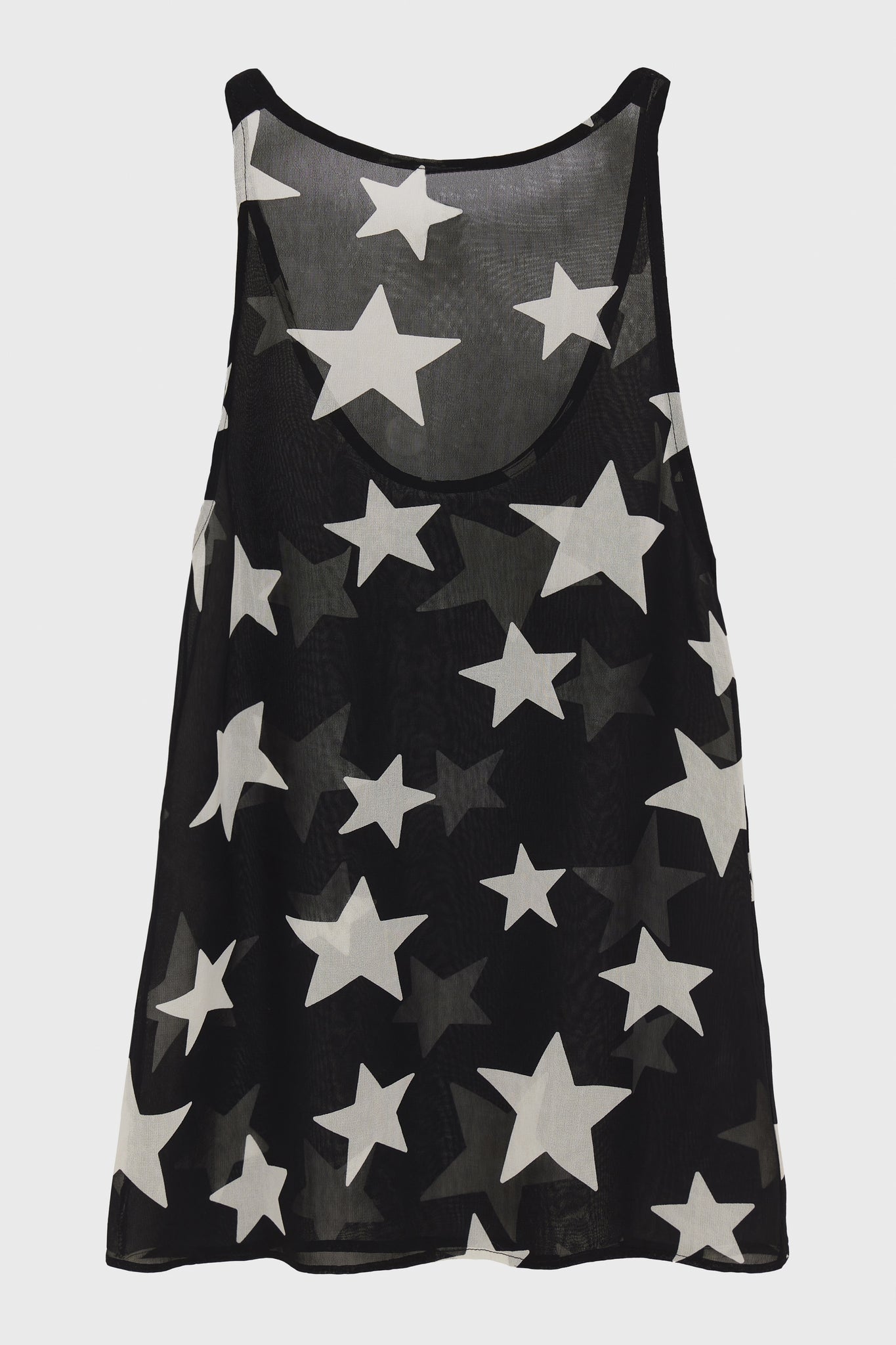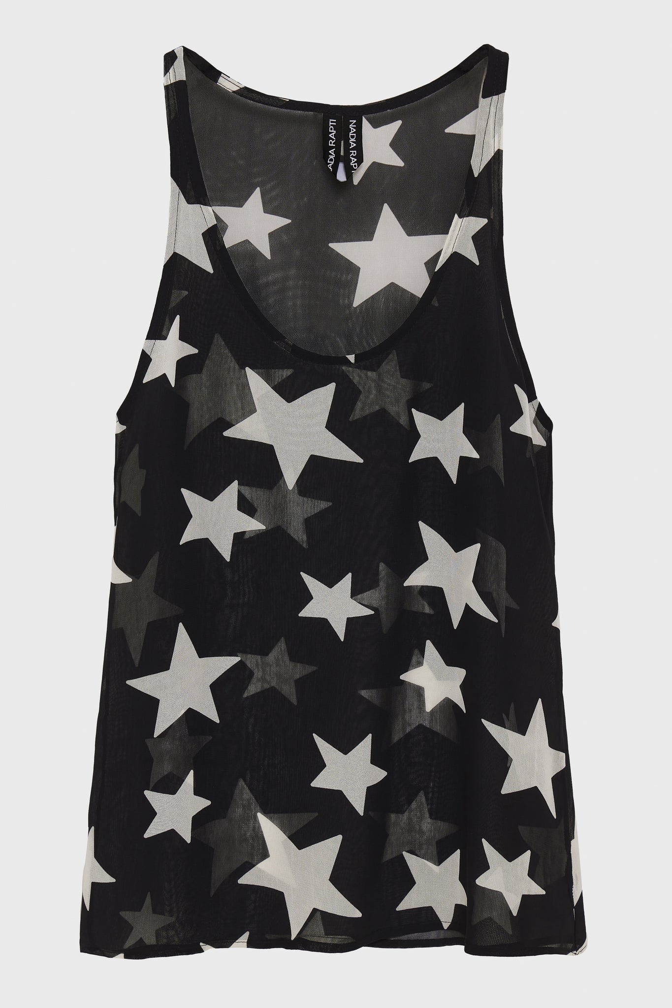 A lightweight sleeveless top in viscose georgette, adorned with multicolour star motifs that bring a playful rhythm to a minimal silhouette. The semi-sheer texture and fluid cut offer ease and movement, while the graphic print lends a touch of unexpected vibrancy. Designed for effortless layering and everyday wear with distinction.