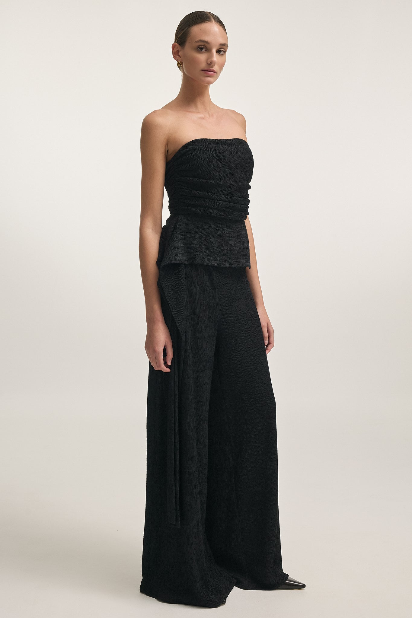 High-waisted wide-leg trousers made from lightweight flowy fabric for an effortlessly elegant look. Designed to elongate the silhouette and move gracefully with every step. Pair with the matching strapless top for a refined coordinated ensemble.