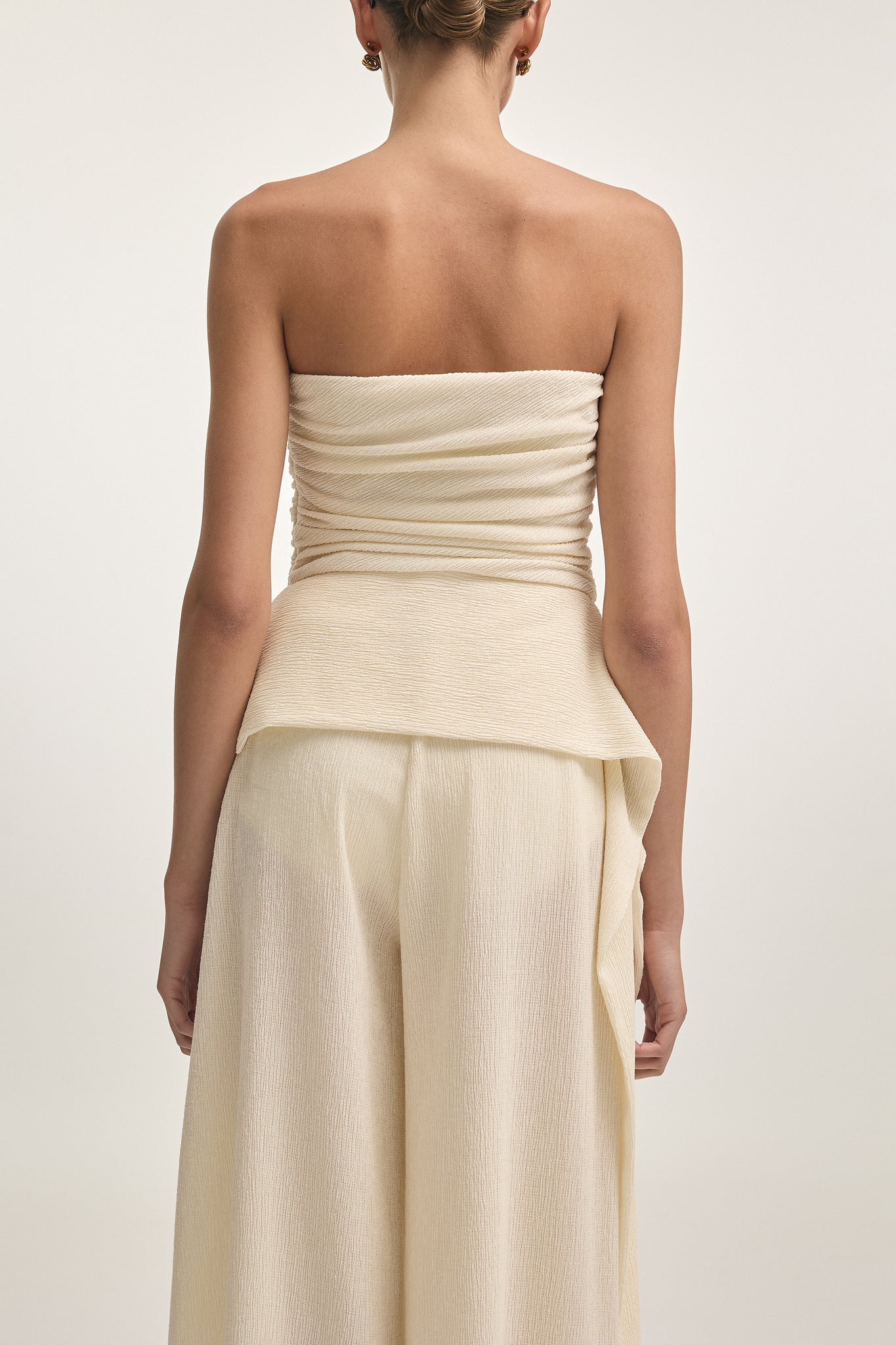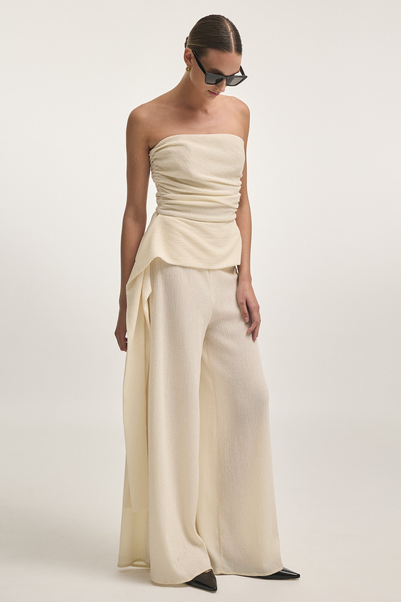 High-waisted wide-leg trousers made from lightweight flowy fabric for an effortlessly elegant look. Designed to elongate the silhouette and move gracefully with every step. Pair with the matching strapless top for a refined coordinated ensemble.